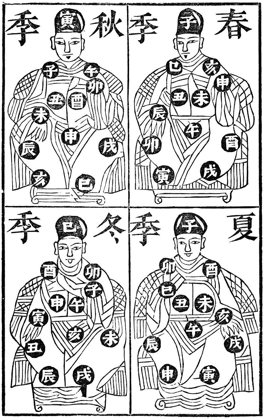 In China, as throughout the western world, curious superstitions attach to human life in all its various stages. The hour and day of an infant’s birth are as much a matter of solicitude to the Chinese female as to the “wise woman” of our own North-country hamlets.1 The queer-looking almanacks to be found amongst the stock of every native bookshop or stall, invariably contain a series of figures representing a fanciful deity, whose title may be rendered as that of the Emperor “Four Quarters” or “All the Year Round,” each figure having one of the horary characters placed on some portion of its person. Thus, during the spring quarter the sign for from 11 to to 1 o’clock a.m. appears on the forehead; that for from 9 to 11 o’clock on the shoulder; that for from 1 to 3 o’clock upon the stomach; etc. (See illustration). When a child is born these diagrams are consulted, and according as the hour mark occurs upon the forehead, shoulders, hands, legs or other portion of the body, so they augur the future destiny of the child. Thus title and degree will be the lot of him who is born at noon. The child who makes his appearance between 9 and 11 o’clock will have, in the familiar words of the gypsy, “a hard lot at first, but finally great riches.” Toil and sorrow, however, will be the portion of the unlucky baby who first sees the light between 3 and 5 a.m., or p.m., and so on.2