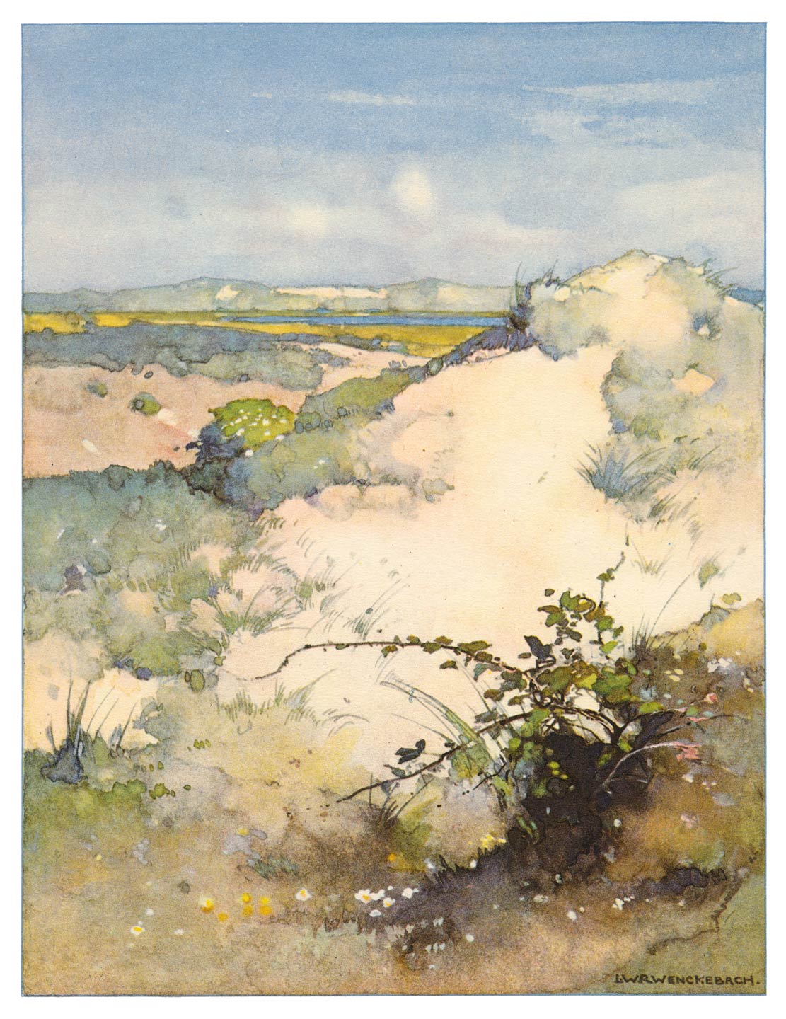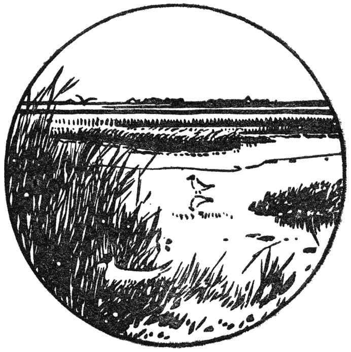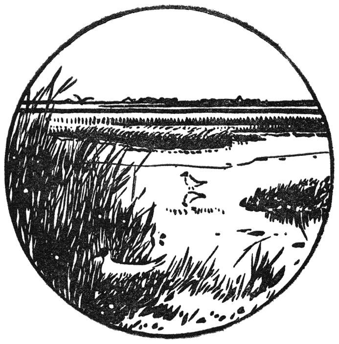 Nu opstappen weer en in den reinen lenteavond dwars door het eiland naar het verre duin, dat ons zijn schaduwzijde toekeert. Daarboven welft zich de blanke lucht en rondom ons heen tierelieren de Leeuweriken (63). Vlak bij ons zien we ze de hoogte ingaan of neerdalen en met hen jodelen en jubelen al de langbeenige waadvogels, op een enkele na. De lammeren spelen op de walletjes—voor zoover die niet met prikkeldraad bezet zijn, terwijl hun flegmatieke mamma’s liggen te herkauwen tusschen de boterbloemen. [25]