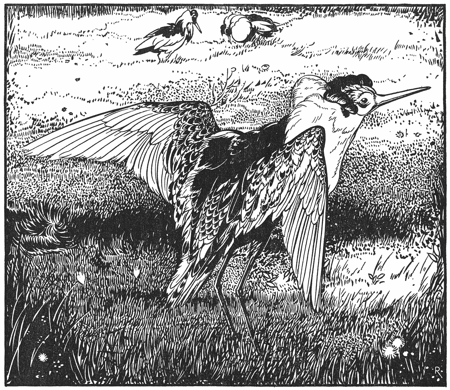 Nu is het een lust, om in die kleurige wei de blijde vogels te zien dartelen. Het spreekt van zelf dat de lucht vol hangt met tierelierende Leeuweriken en Piepertjes. Ook zien we telkens Leeuweriken vechten tusschen de bloemen en zelfs midden op den stoffigen weg en ik ken weinig grappiger voorvallen uit het vogelleven, dan dat die Leeuwerikjes, verhit door hun vechtpartij, met gehavend [30]gevederte en opgestoken kuifje zingend een poos rondloopen en pas later bedenken, dat ze eigenlijk behooren te vliegen, als ze zingen zullen op zoo’n mooien zomerdag. Ze zijn niet de eenige luchtzangers. Dikwijls genoeg gaat nu nog met vroolijk gejodel zoo’n roodsnavelig roodpootig Tureluurtje de hoogte in en als hij een meter of dertig hoog is gekomen, dan daalt hij op neerwaarts gespreide vleugels langzaam neer, steeds fluitend. Hier en daar schermt en buitelt en schreeuwt een Kievit, maar we zien ze ook kalmpjes rondstappen tusschen de bloemen en het wit-pluizige wollegras. ’t Is of al die vogels weten, dat een voorwerp, dat voortrolt op den rechten, door slooten begrensden polderweg, hen niet kan deren en wij zien die Kieviten (84) van zoo nabij, dat we kunnen genieten van de purperen en groene staalglanzen op hun gevederte en de parmantige houding van hun wapperende kuif. De Grutto (79) komt dicht genoeg bij ons, om zijn aardig gevormden rossen schedel te vertoonen en zijn rossen hals en zwart met witten staart. Kalmpjes stapt hij op zijn lange beenen door de wei en met zijn langen snavel slaat hij hier of daar een torretje van de grassprietjes af, want al die modderkrabbers houden op hun tijd toch ook wel van zoo’n harden insectenbout. Dezer dagen zit ’t gras vol met Kniptorren en daar eten ze nu allemaal van: de Grutto’s, de Kieviten, de Tureluurs, de Scholeksters, de Piepers, de Leeuweriken. Van de Scholeksters (80) weten we zeker, dat die ook uit den grond de larven van die kniptorren opdelven, dat zijn de beruchte ritnaalden, die door hun geknaag aan de wortels zoo’n groote schade toebrengen aan het grasgewas.
