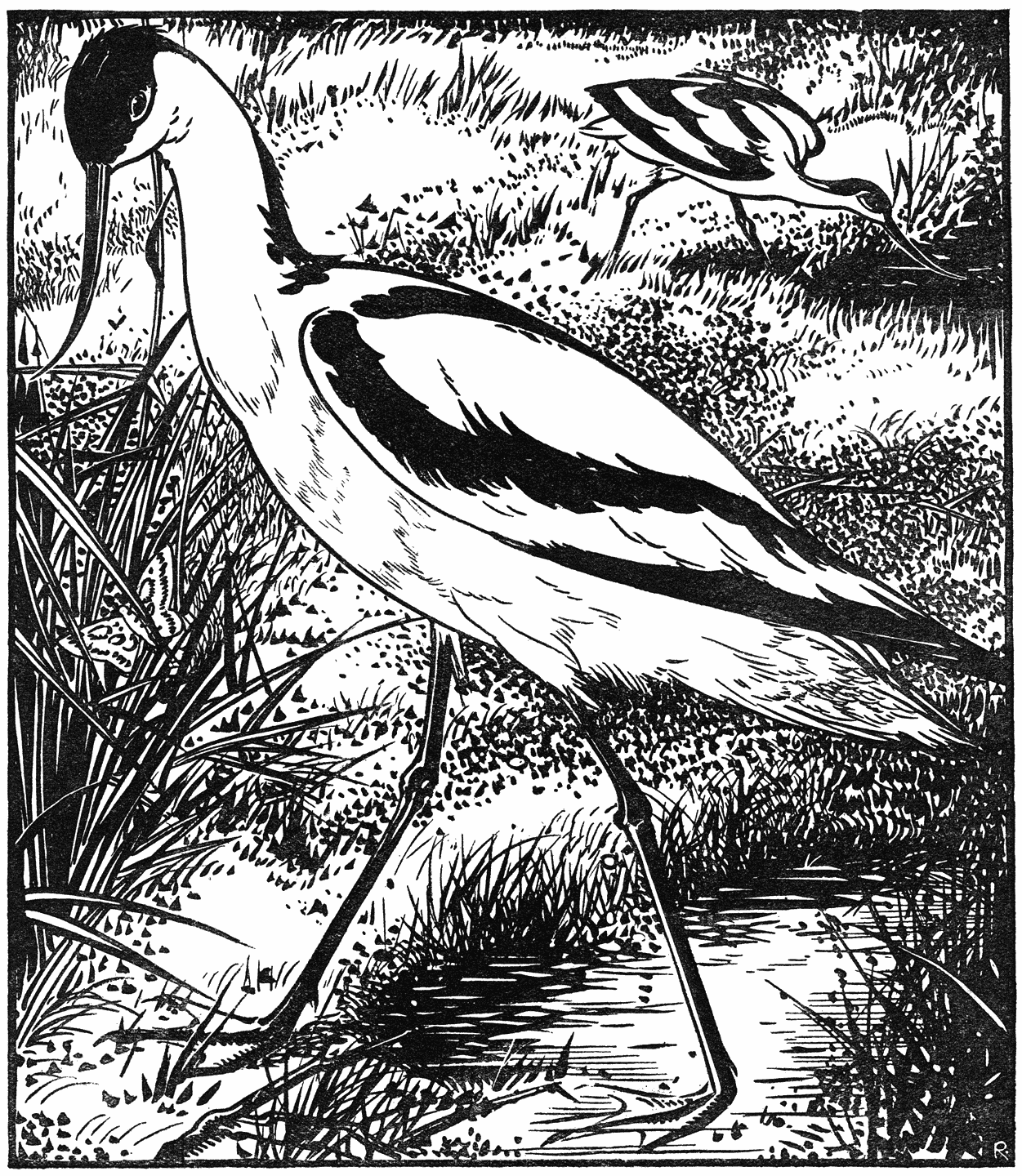 We stijgen hier even af, om op ons gemak naar de Kluten te kijken. Ze zijn in ’t geheel niet schuw. Op hun lange loodgrijze pooten waden ze door de plassen en langs de slootkanten. Als ze naar den anderen oever willen gaan, zwemmen ze doodbedaard door het diepe water heen en dat gaat heel goed, want ze hebben flinke zwemvliezen aan hun voeten. Wat een mooie vogels en hoe eenvoudig van kleur: het gevederte niet anders dan sneeuwwit en pikzwart. Ook de lange, merkwaardig gevormde, omhooggebogen snavel is zwart. Het is een lust, ze te zien rondstappen in het ondiepe water, rustig op hun lange beenen, den hals vooruit en omlaag gestrekt en dan maaien ze met hun snavel door de weeke modder, waarin allerlei gedierte huist, voornamelijk bescheiden verwanten van Kreeften, Krabben, Garnalen en zulk gedoe. Dit is wel een van de merkwaardigste vogels van ons land en alleen reeds een reisje naar Texel waard. We zullen die Kluten vinden over het heele eiland heen, aan de stranden, zoowel als in het binnenland en je krijgt hier den indruk dat het een heel gewone vogel is. Dezelfde ervaring doe je op aan het eilandje bij den Hoek van Holland, in het Voornsche duin en op een paar plekjes op Schouwen. Hier en daar langs de Zuiderzee broedt hij ook wel, maar dat is dan ook alles. In Engeland broedt hij niet meer, in Duitschland aan de Oostzee heel zelden, maar wel veel in Jutland, in Zuid Spanje, langs de Middellandsche zee en door heel Azië (met zijn brakke meren) heen tot in Japan. Hij zit dus hier op een voorpost en wij mogen hem wel in eere houden. Dat doen we dan ook.