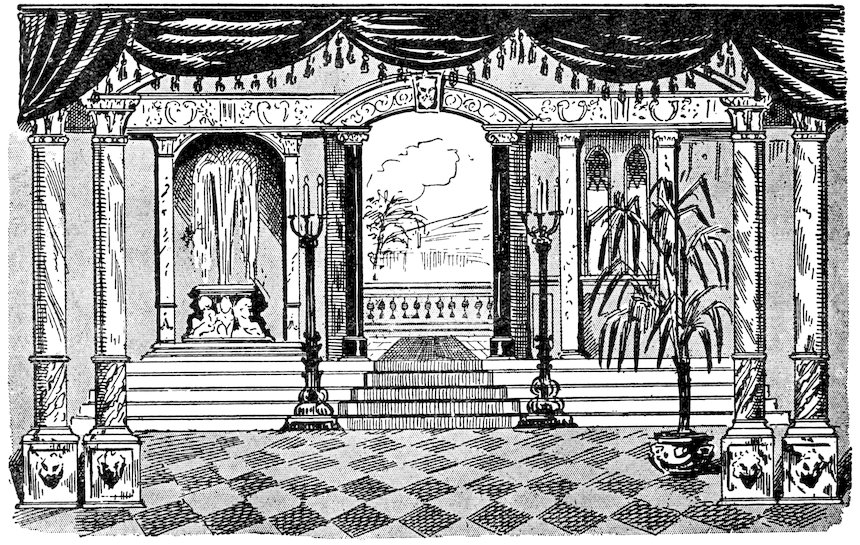 When the skeleton is in place, it is only necessary to mask the front with a painted proscenium, hanging curtains right and left and above, thus entirely shutting out the audience when the curtain is dropped.