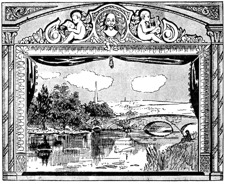 The earnest beginner will no doubt desire to adapt his designs to the play to be represented, but he will usually find very little guidance in the author’s directions. Such directions are scant and laconic, except where the position of a door, window, or fireplace is concerned. This reticence of authors is a blessing rather than a restriction, for such directions as ‘Interior of a cottage,’ ‘A drawing-room,’ ‘A stile by a cornfield,’ ‘A woodland stream,’ give the scene painter a free hand in depicting that which his fancy may dictate. A number of the illustrations in this book will be found useful as suggestions for exteriors and interiors suitable for a goodly collection of domestic plays dealing with home life, but where, as in many of Shakespeare’s plays, the scenario lies in Italy and other parts of Europe, or as in The Only Way and The Scarlet Pimpernel, Paris of the Revolution is dealt with, some attempt must be made to get local colour or the effect will be ludicrous. There are occasions where one need not be too particular. For instance, a Baronial Hall covers a long period of English History; it can even be made quite modern when the play deals with personages of ancient lineage, but the amateurs we saw who depicted a stirring incident in the Soudan war inside a Dickensian cottage, required too elastic an imagination from the audience. Where local colour must be got, the scene painter should look up some private prints or illustrations of the period, or, where possible, good 32pictures of the actual incidents in the play, an easy matter in the case of Shakespeare.