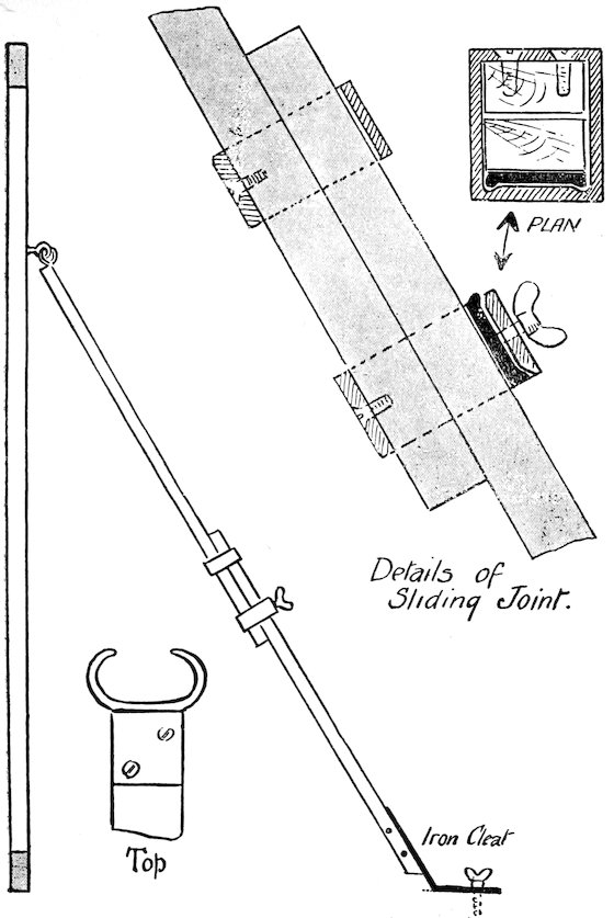 These pieces should have eyes screwed in the backs for engaging hooked rods which are united to the stage and act as supports. One illustration shows the simple form of these braces, the other shows in working detail a patented extending brace which is designed to deal with any piece of scenery that may come to hand, for by loosening the thumb-screws at the joint the brace can be shortened or lengthened to enable the hooked top to catch in the fixed eye on the flat, etc., at any angle.