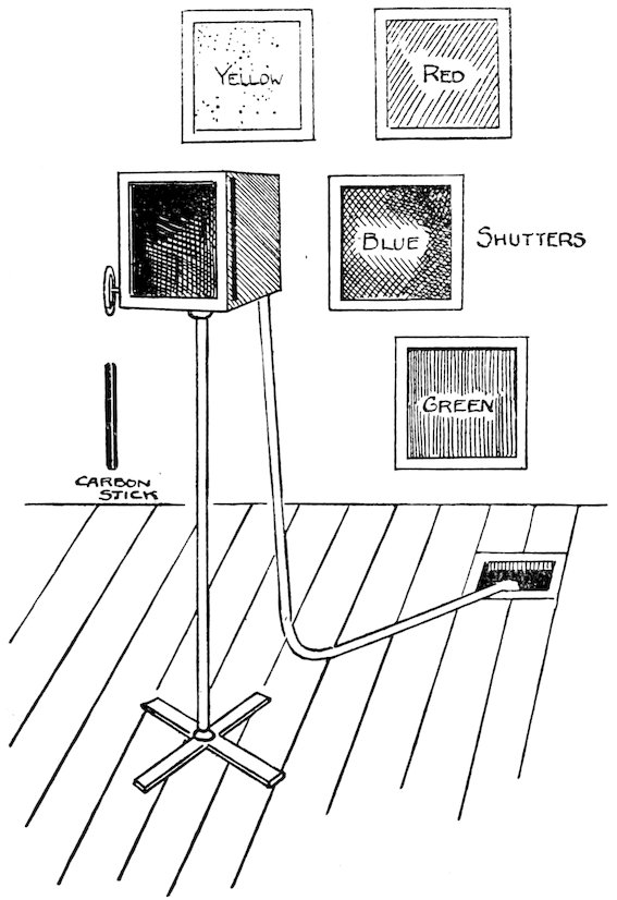 And how clever some of those effects are! It is worth the while of anybody at all interested in 3theatrical matters to inspect the scenery arrangements at an up-to-date theatre. At every turn he will find something to wonder at and admire. Quite recently at one of the London theatres there has been installed a new electrically driven equipment for raising and lowering cloths, sky borders, curtains, and for setting ceilings, etc. It has proved a great success. Wire is used instead of the old hempen ropes, and this is an enormous advantage from the fire-risk point of view. Further, it has enabled the number of stage hands to be reduced. The equipment works with far less noise than the ordinary hand system, and much more quickly and certainly. It seems quite likely that before long this electric-power system will be the one adopted at all the big theatres, but for the smaller theatres, and certainly for the halls at which amateur companies usually give their performances, the old system will continue to be used.