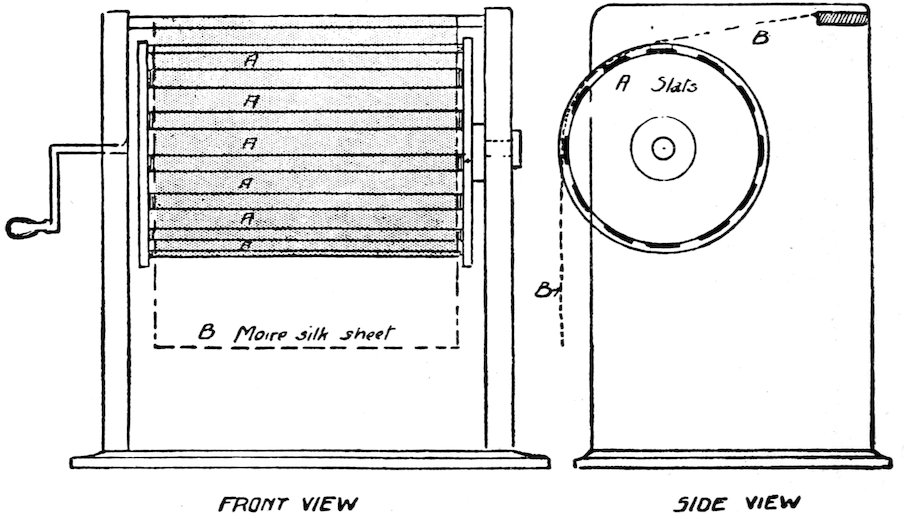 Stage wind is produced by means of a large drum or wheel made of slats of wood, with about three inches of space between the slats. This drum is fastened to two uprights and has a large handle 71attached to the centre, so that it can be turned round and round very easily. Above the drum is fixed a stout rod, from which hangs a large piece of moiré silk. This silk hangs over the drum, and when the drum is turned the sound made by the slats of wood touching the silk produces the sound of wind. The illustrations show how the appliance can be made.