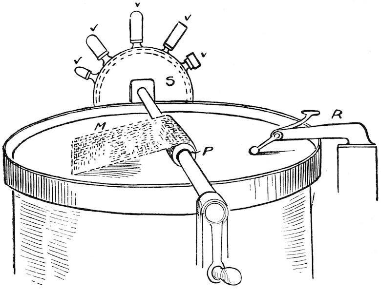 The second drawing (Fig. 3) shows a drum fitted up for producing a variety of sound effects. ‘M’ is a kind of apron of woven wire, which is wound on a drum ‘P’ by means of the handle shown. When the drum is struck the skin on returning strikes the mat with a sharp crack or bang, a sound resembling the firing of heavy artillery. By winding up the mat on its roller the sound can be increased or decreased as desired. On another part of the drum ‘R’ is an instrument for producing the effect of a motor car travelling at various speeds. This can be attached to clock-work mechanism instead of using the handle or lever.