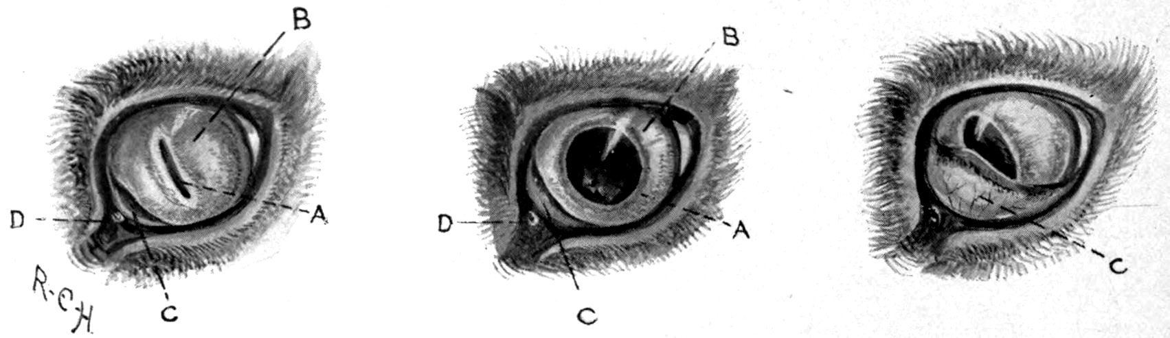 The eyelids are also subject to wounds, bruises, abscesses, warts, and Meibomian cysts, which do not call for special attention. The third eyelid, haw, or membrana nictitans—though, as before stated, it is not so well developed in the cat as in some other animals—is liable, in debilitating diseases, such as distemper, anæmia, etc., to protrude persistently over the inner part of the front of the eyeball. It will, however, resume its normal position as the cat regains strength, and should, therefore, on no account be removed. It frequently becomes inflamed during distemper, catarrh, or ophthalmia, or from injuries, but should not in these cases be removed, as if it were a foreign body or new growth; a simple soothing, antiseptic lotion will put it right as the original disease abates and strength is regained.