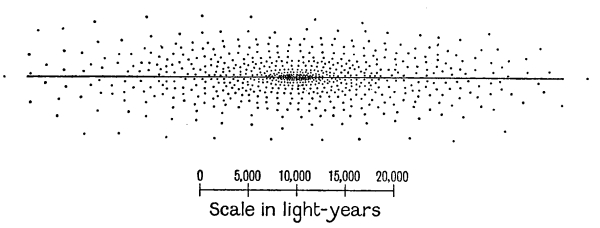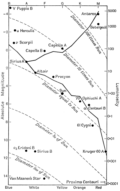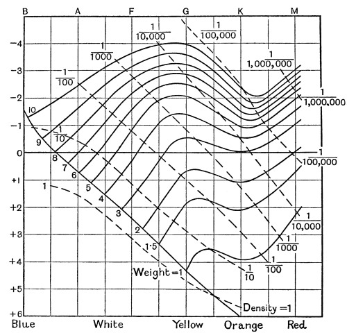 [25] For purely practical reasons the height is not taken proportional to the luminosity but to its logarithm; without some such device as this it would be impossible to represent the range of more than 1,000,000 to 1 in the observed luminosities of red stars.