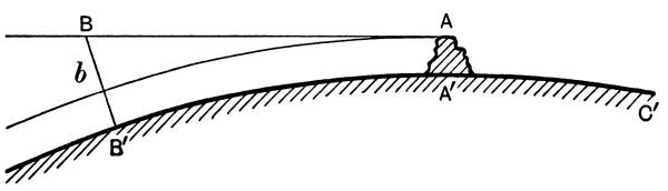 where Bb = 16 feet, and BD, which is 16 feet more than the earth’s diameter = 41,900,000 feet. From this we readily calculate that BA = 25,880 feet. This calculation of course neglects the height of the hill AAʹ by comparison with the earth’s diameter.