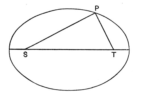 [5] The simplest definition of an ellipse is that it is the curve drawn by a moving point P which moves in such a way that the sum of its distances PS, PT from two fixed points S, T remains always the same. In practice we can most easily draw an ellipse by slipping an endless string SPTS round two drawing pins S, T stuck into a drawing board. Stretch the string tight with a pencil at P, and on letting the pencil move round, keeping the string always tight, we shall draw an ellipse. If the pins S, T in the drawing board are placed near to one another the curve described by the pencil P is nearly circular. The ratio of the distance ST to the length of the remainder of the string SP + PT is called the “eccentricity” of the ellipse; it is necessarily less than unity, because two sides of a triangle are together greater than the third side.