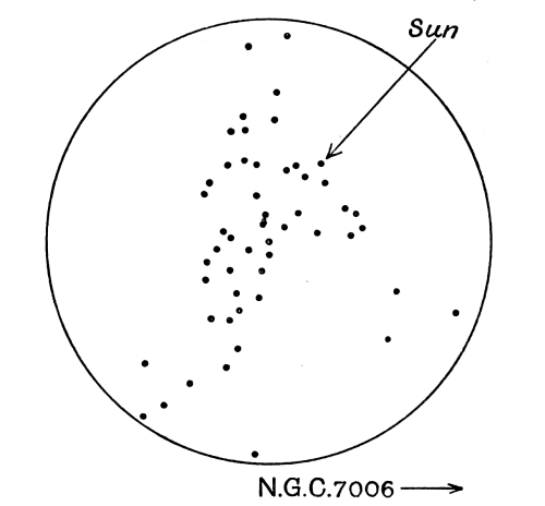 [7] For instance, Cepheids whose light fluctuates in a period of 40 hours have approximately a luminosity 250 times that of the sun, and so are of 8 × 10²⁹ candle-power; a period of ten days indicates a luminosity 1600 times that of the sun, or a candle-power of 5·17 × 10³⁰, and so on. If a star in a distant astronomical object is observed to fluctuate with a period of ten days, and the quality of its fluctuations shew it to be a Cepheid variable, we know that its actual candle-power must be 5·17 × 10³⁰. Its apparent brightness is observed to be that of a star of, say, magnitude 16, which, stripped of technicalities, means that we receive as much light from it as from a single candle at a distance of 570 miles. The difference between one candle and 5·17 × 10³⁰ candles accordingly corresponds to the difference between 570 miles and the distance of the object in question, whence, since light falls off as the inverse square of the distance, we calculate that the distance of the object must be