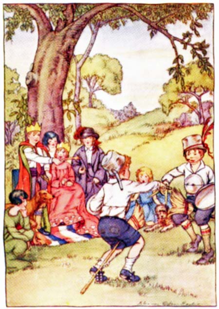 Yes, there were ten in that procession, including the Irish setter named Nap, and the airedale[19] named Jerry. First, as we said before, there was Johnathan Baxter, King Arthur, dressed in the green and red portiere with tassels, that had graced so many courtly ceremonies. The paper crown was on the kingly head, and in the royal hand was the oak-wood scepter. Close on his majesty’s heels walked her majesty, Queen Guinevere, Janet Jane Baxter, resplendent in a long pink mother hubbard, one of Mrs. Baxter’s cast-off garments, made theatrical and queenly by the silver paper stars that were pinned around the hem. Following her was Susan Oliver, five years old, bearing up the queen’s train, a child with eyes like mulberries and a blue-black cloud of hair. She was pouting because she felt it was her turn to be the queen, and before the procession started it was very doubtful if she would play at all. The promise of queenship next Saturday finally quieted her, although she carried the train with a disdainful air that ruined the dignity of the queen, since it dragged the ground on one side and looped up too far on the other, showing the queen’s long, spindly legs.