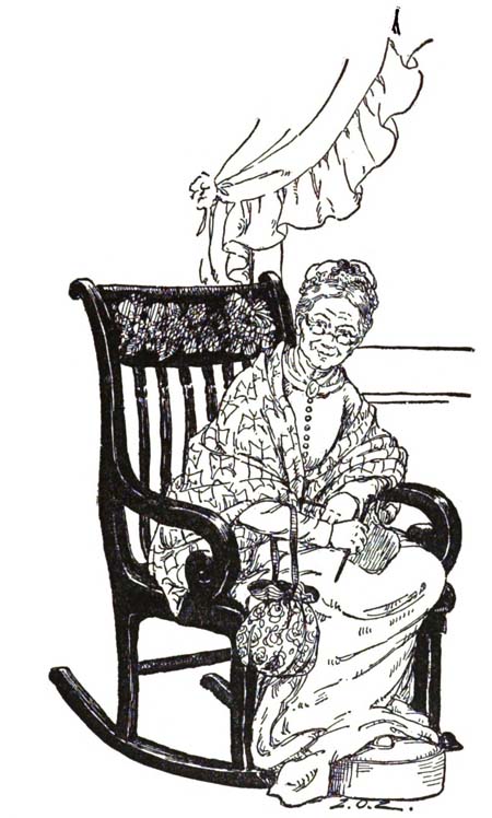 But this was impossible to keep up, for as soon as the toe was put back something else would run away, and so it went, and they thought surely Mig would escape, when Grandma, fumbling in her mysterious knitting bag, brought forth many balls of colored yarn, and whirling one around her head like a lasso, she entangled the crumbling stone in meshes of red and yellow wool, winding it around and around—around and around—just as a spider winds his silken thread around a poor captive fly or green grasshopper. And soon the stone was quiet and from the heart of it and through the tangled yarn came a gruff voice saying, “Let me out—let me out—I’m Mig, and I’m sorry—I’m sorry—”