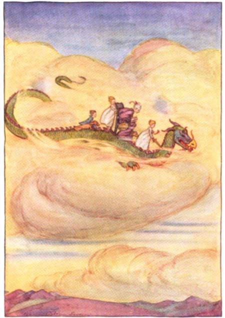 The dragon continued to smile, oh, so sweetly, and tears gathered in his light blue eyes. “You didn’t think dragons lived any more,” he sighed, stretching out his great gold claws like a sleepy[29] cat, “and you’re almost right, because I am the last dragon in all the world”—and two big tears the size of cups of clear water, dropped to the ground.