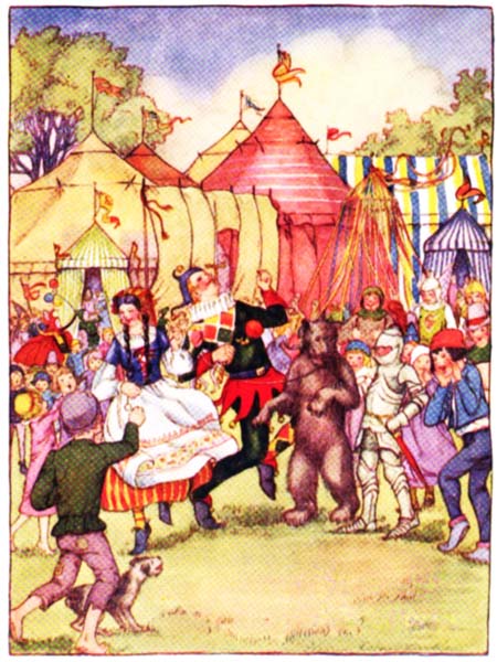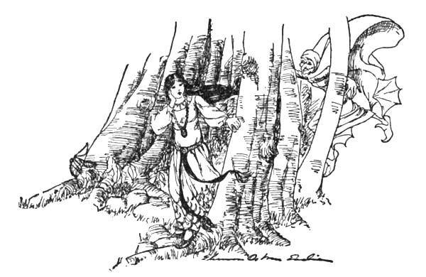 At the king’s command, the knights drew their swords and pointed them down to the ground and bowed very low to the king. Then they went to[22] the saplings and untied their horses and mounted them. The fiery steeds leaped up and down and nearly threw the knights off, and the grass of the meadow was torn up by whirling feet.