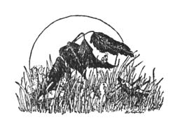 Their appearance scattered two chubby meadow mice into a desperate rush for their holes, and a flock of Jenny wrens fled chittering, indignant at being disturbed, like little gray ladies at a tea party. There was quite an impressive procession advancing toward the king’s throne. It had formed at the back door of the Baxter house, under the alert eyes of Grandma, watching from her upstairs window, and led by Johnathan who of course was king, King Arthur, no less, it wound through the rose garden, up the lane past the fish pond, over the creek bridge, through the truck garden, skirted the barn and wriggling through the orchard it bobbed its ten small heads to escape hitting the low branches of the willow clump, filing through a tunnel of green leaves to the open spaces of the dewy meadow.