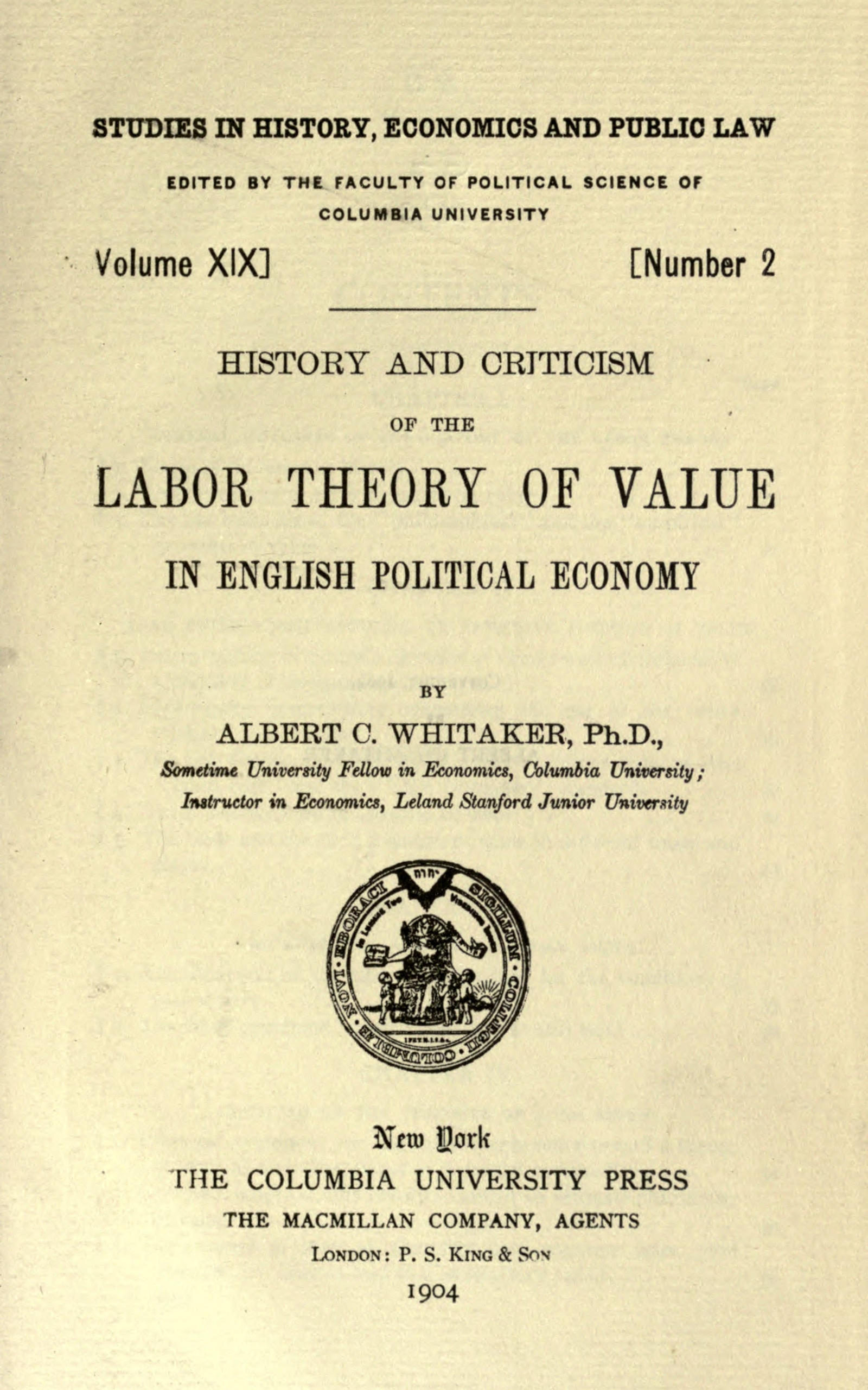2. History and Criticism of the Labor Theory of Value in English Political Economy. By Albert C. Whitaker, Ph. D. Price, $1.50.