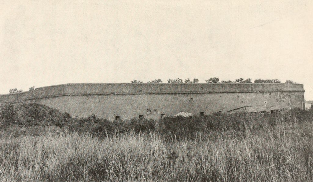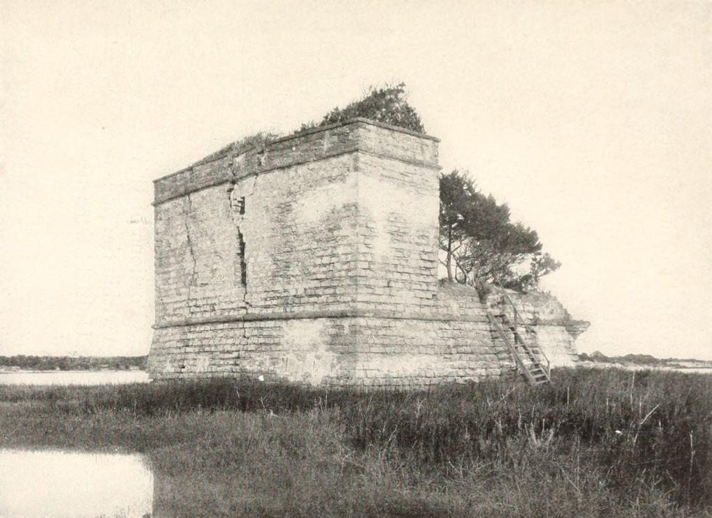 In the meantime, another English settlement having been made in Georgia by General Oglethorpe, the English drew nearer to Florida and occupied a country still claimed by the Spanish Crown. The Spanish Governor notified Oglethorpe to depart, and gave indications of a forcible attempt to dispossess the new colony. Oglethorpe determined to be beforehand with the Spaniards, and organized an expedition made up from his own colony and Carolina, and proceeded to invest St. Augustine by sea and by land. The town was now, however, better fortified, and the Castle had been greatly strengthened. Oglethorpe’s batteries on Anastasia Island were too light to make an impression upon the walls of San Marco, the soft rock imbedding his balls without injury. The siege lasted thirty-eight days, but, being unable to reduce the Castle, Oglethorpe at last gave up the attempt, and withdrew his forces. The marks of his cannonade may still be seen on the eastern walls of the fort.