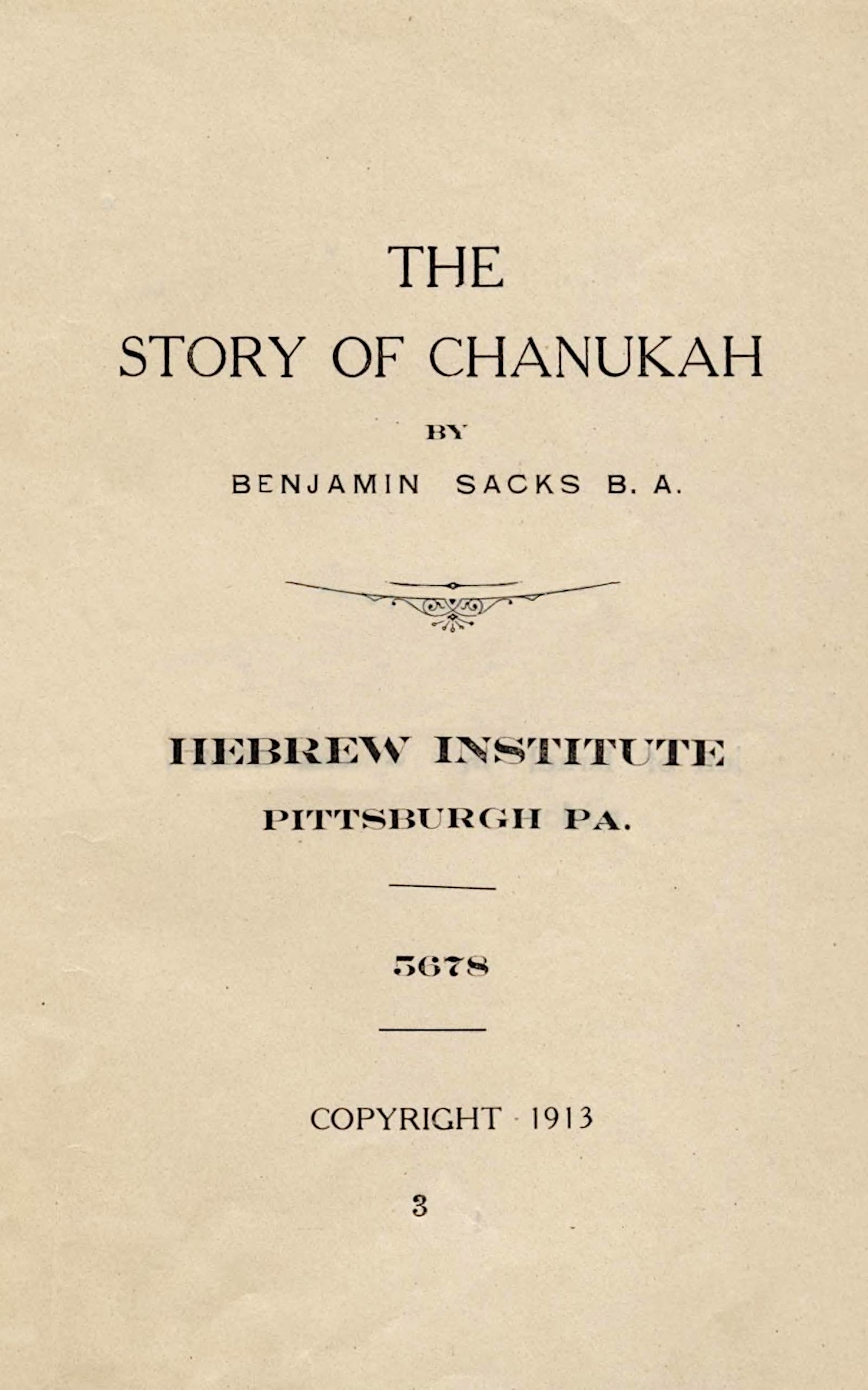 The Talmud relates that when the purification of the Temple had been completed, no consecrated oil could be found with which to light the golden candlestick. After a careful search, however, a small bottle of oil, with the seal of a former High Priest still on it, was found. But it contained only a small quantity of oil, hardly sufficient to last for one day. But lo! a miracle happened. When the oil was lit, not only did it last for one day but for eight days! This was interpreted as a sure sign that God was looking 29upon the work of his people with favor, and served to increase their happiness.