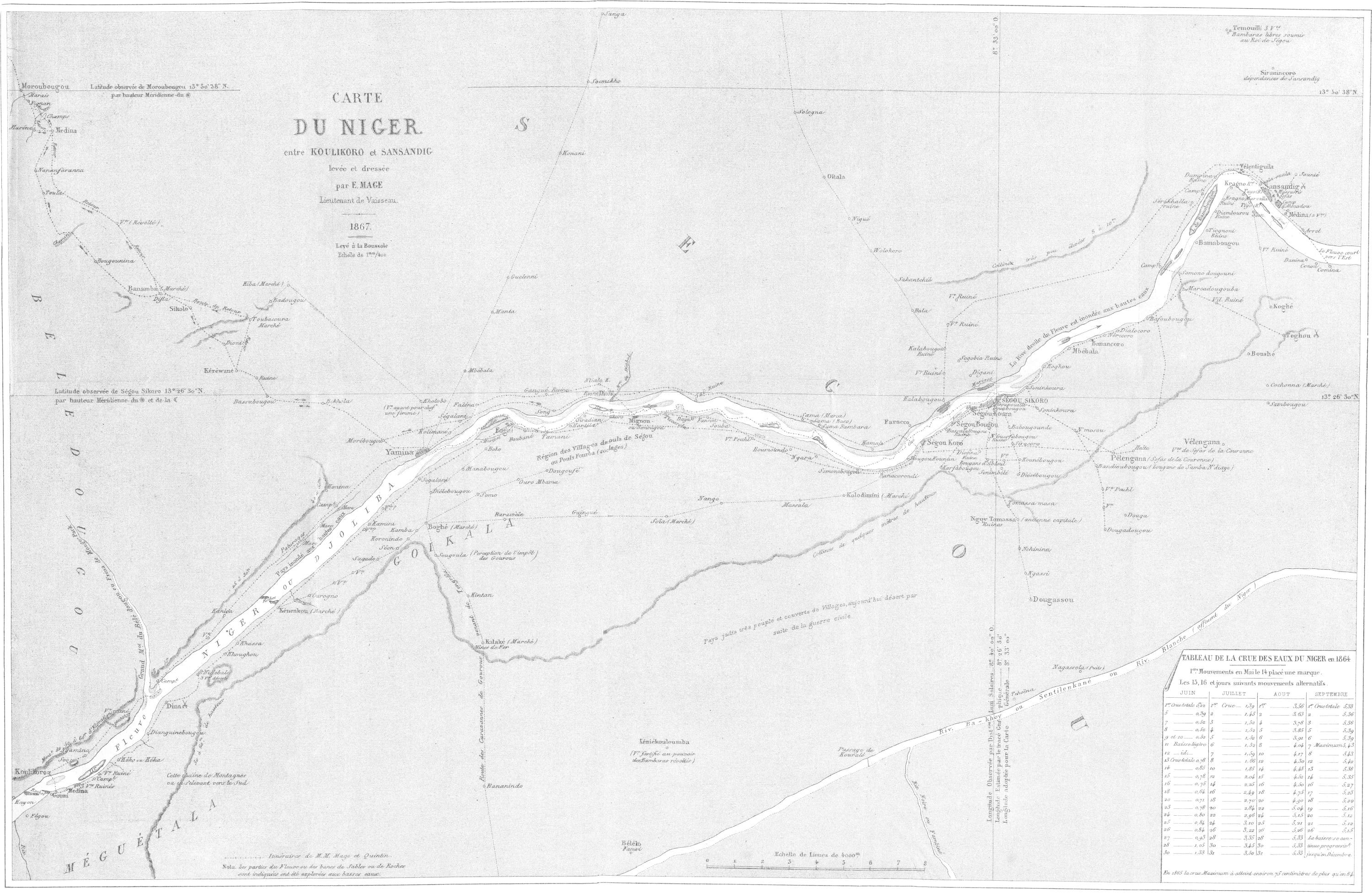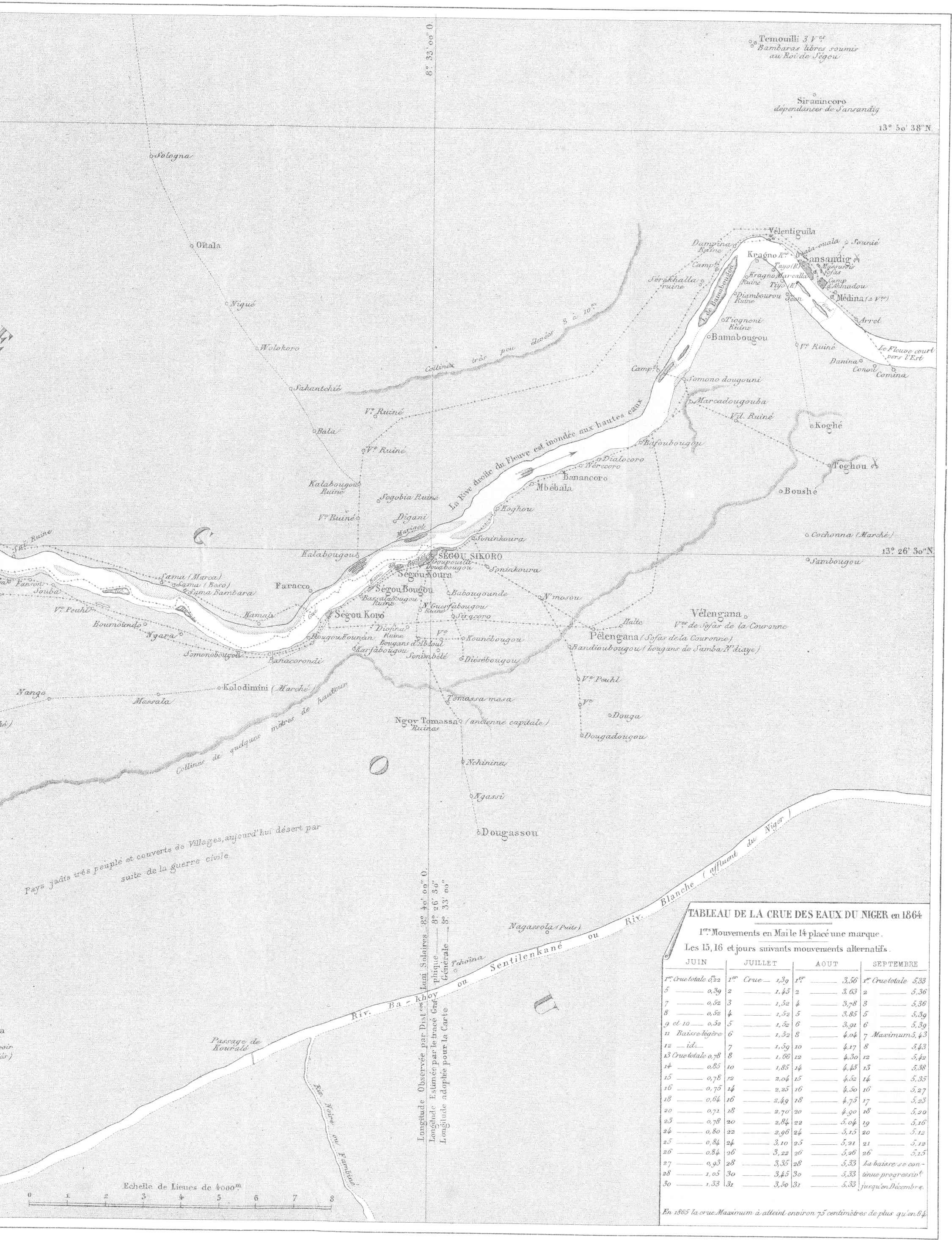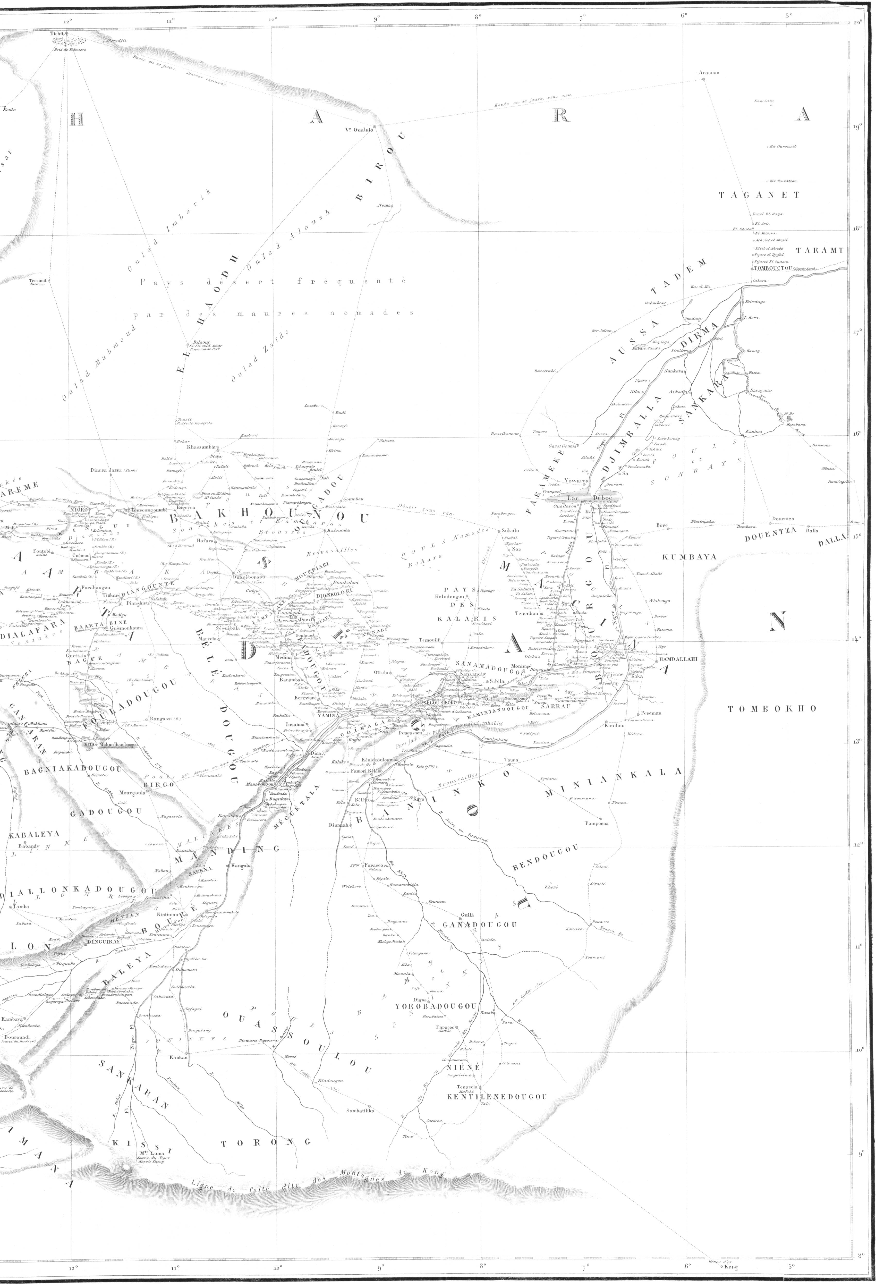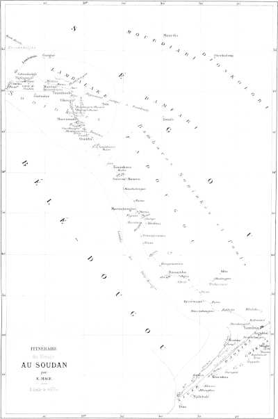 « Un petit-fils d’Ahmadou Labbo, fondateur du Macina, réfugié chez les Mouchis, a repris le pouvoir après la bataille de Goundam, à Hamdou Allahi. Cette ville, d’après notre informateur, serait dix fois plus grande que Tombouctou. Il donne cependant à cette dernière ville de trente à quarante mille habitants, près du double de l’évaluation de Barth. Les deux obusiers de 0m,12, abandonnés faute d’affûts par le commandant de Bakel, dans une expédition du Bondou, en 1857, avaient été ramassés par les gens d’El Hadj Omar, et celui-ci les traînait avec lui dans toutes ses guerres. Ils auraient été pris par l’armée d’Ahmed el Beckay, à la bataille qui s’est livrée sous Tombouctou, et ils seraient aujourd’hui dans cette ville. Tombouctou possède huit autres pièces d’artillerie, trois en bronze et cinq en fer, qui proviennent de Kagho, ancienne capitale, à une centaine de lieues en aval de Tombouctou. Elles avaient été amenées à Kagho par l’armée marocaine du pacha Djoddar, vers la fin du seizième siècle. Nous avons fait prononcer le nom des aborigènes de la contrée où sont les villes de Tombouctou, Kagho et Djénné, par Sidi Mohammed, pour être bien fixés sur ce nom, écrit de tant de manières par les voyageurs. Il prononce Sonkhey, la première voyelle nasale comme notre article possessif son ; quant à la consonne qui suit, bien que Sidi Mohammed prononce kh, il écrit ق, Qof. Barth a écrit ce nom Sonrhaï. Les vocabulaires de cette langue ont été donnés par Caillé, sous le nom de Kissour, par Raffenel, sous le nom d’Arama et par Barth.