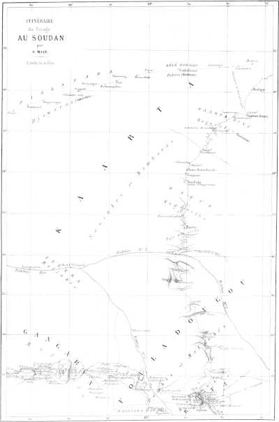 J’avais surtout besoin d’examiner les cartes existantes, de tâcher de les faire concorder avec les itinéraires des voyageurs, de concilier leurs principales différences ; en un mot, il m’importait de séder à fond la question géographique.
