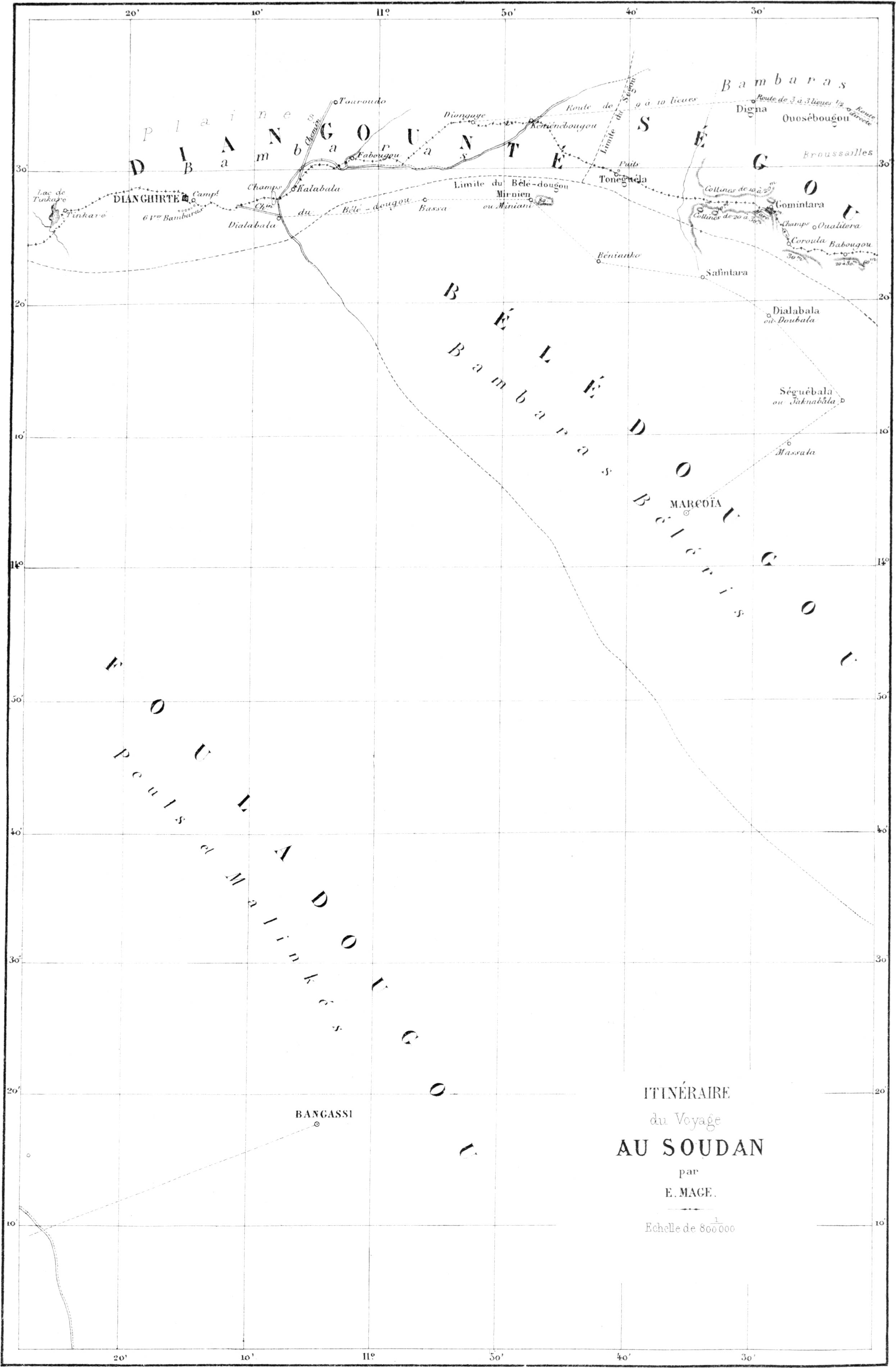 Plus j’approfondissais la question, plus je m’effrayais de l’ignorance dans laquelle on était des points mêmes qui touchent à notre[7] colonie. Au-dessus de Médine, on n’avait de renseignements que par le voyage de M. Pascal, qui s’était avancé fort peu au-dessus de Gouïna[4]. J’avais moi-même visité ce point quelques mois après lui ; mais au delà, à quelle distance se trouvait Bafoulabé[5] ? Ce lieu était-il habité ou non ? A quel endroit trouverais-je des partisans d’El Hadj ? Quelles populations amies ou ennemies aurais-je à traverser pour y arriver ? Quelles ressources enfin trouverais-je dans le long voyage que j’allais commencer ? Toutes ces questions se levaient devant moi, et plus je voulais les éclaircir, plus je lisais, plus je fouillais dans les documents que me fournissait la bibliothèque du Sénégal, plus je trouvais partout le doute ou l’ignorance.