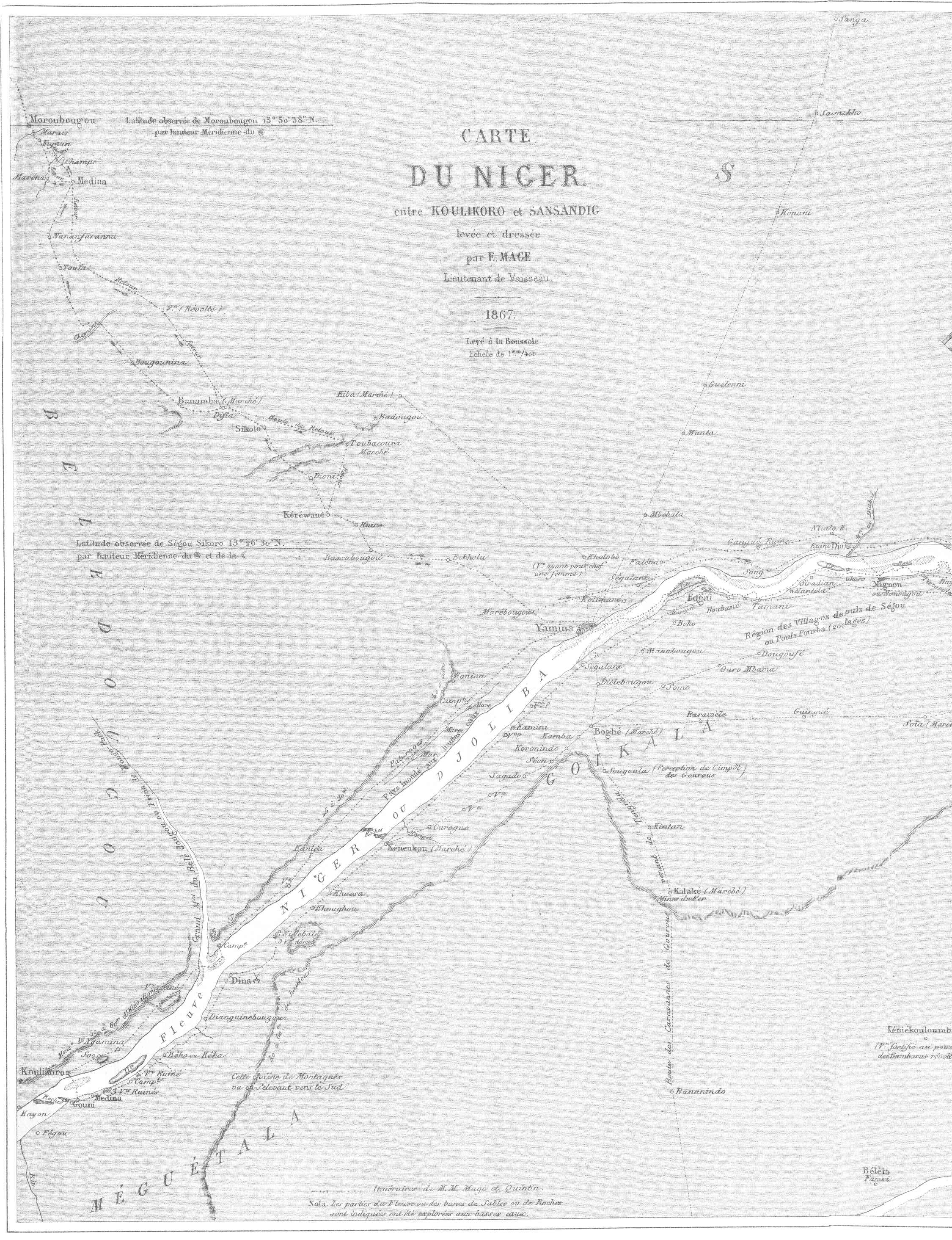 « Telles sont, en un mot, les conclusions du travail si important que M. le colonel du génie Faidherbe vient de faire connaître[1], et si on jette les yeux sur une carte, on est tout de suite frappé de la grandeur de ce projet ; mais avant de se lancer dans les dépenses d’une ligne de postes sur environ quatre-vingts lieues d’étendue, qui séparent Médine de Bamakou en ligne droite, il me semble qu’il faudrait au moins savoir exactement où l’on va, avoir une carte bien exacte du cours du Niger, savoir si les caboteurs pourront naviguer entre les cataractes de Boussa et Bamakou et faire dériver les produits des marchés africains sur Boussa, où nous pourrions établir alors un comptoir dans lequel ces produits seraient reçus et dirigés sur France par des navires qui viendraient les chercher le plus haut possible dans le bas Niger.