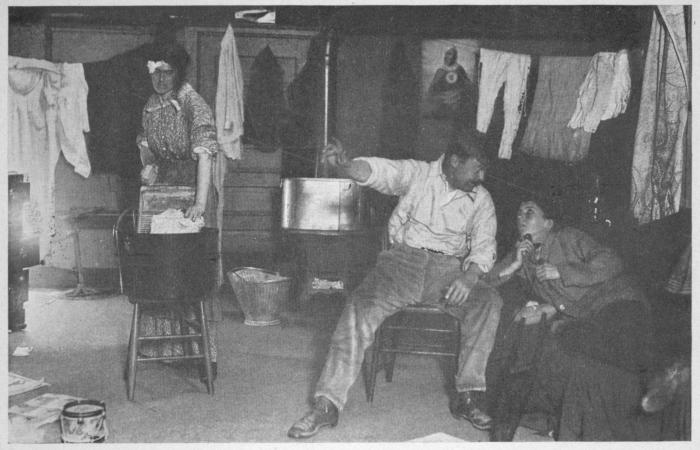 When the curtain rises Nora O’Flaherty is discovered at the wash-tub. She is a large woman, with a worn, sweet face, across her forehead an ugly red cut. The room is untidy, and so is Nora. The stove is blazing hot. After stirring the clothes in the boiler Nora wipes her face with the back of her hand and sighs wearily as she puts a fresh lot into the tub of suds.