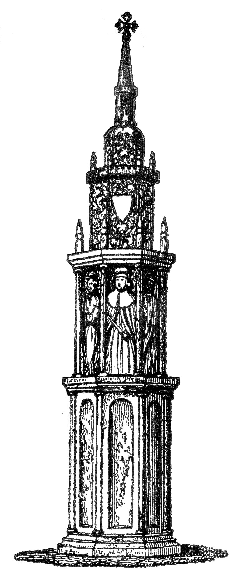 This place has been recently greatly improved by clearing away decaying houses, and enlarging the space for the public convenience, and for the display of newly-erected handsome buildings. It derives its name from having been anciently a village detached from London called Charing, and from a stately Cross erected there by order of Edward I., to commemorate his affection for Eleanor, his deceased queen. The cross occupied the last spot on which her body rested in its progress to sepulture in Westminster Abbey. The other resting-places of her sumptuous funeral were dignified by similar edifices.