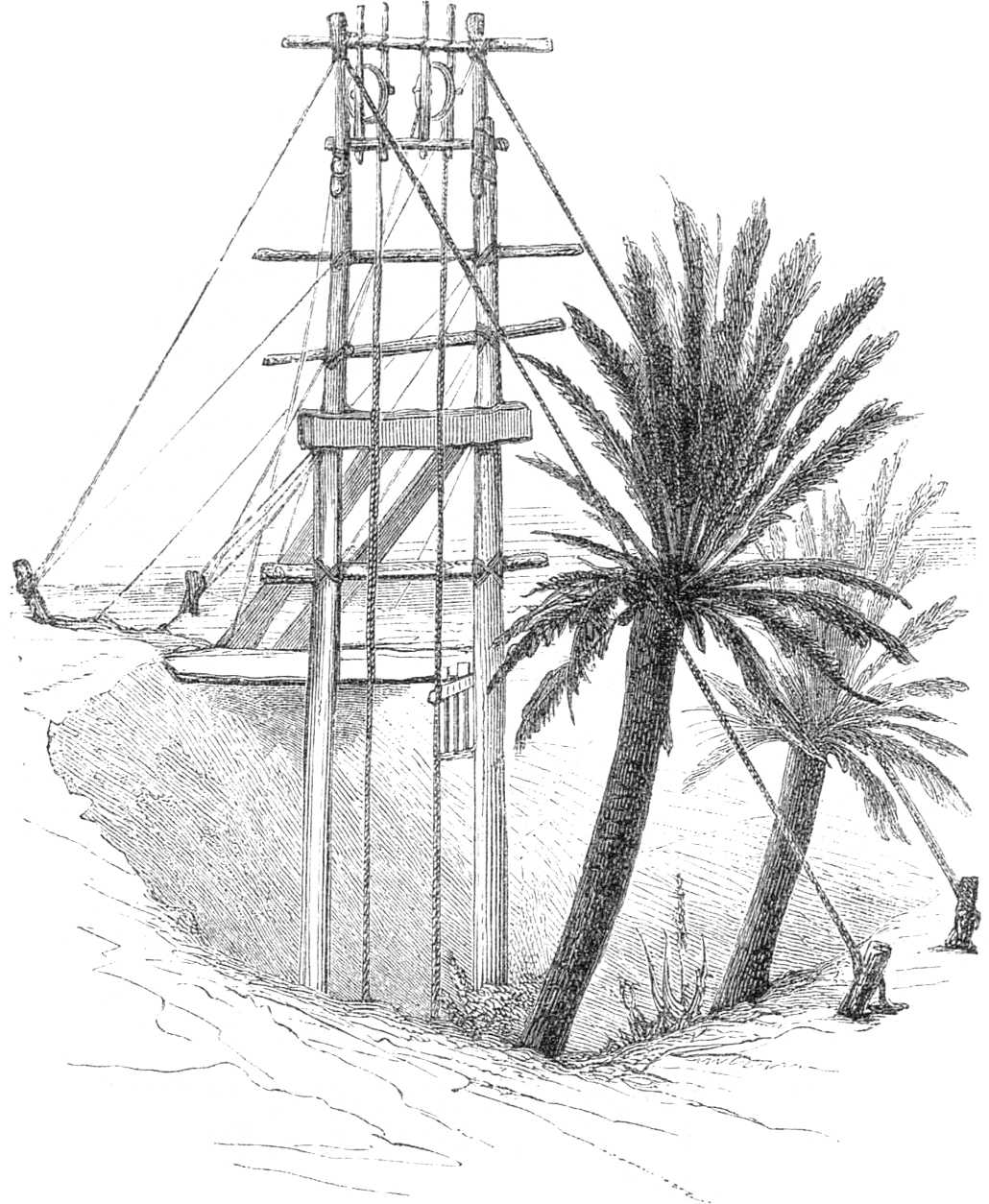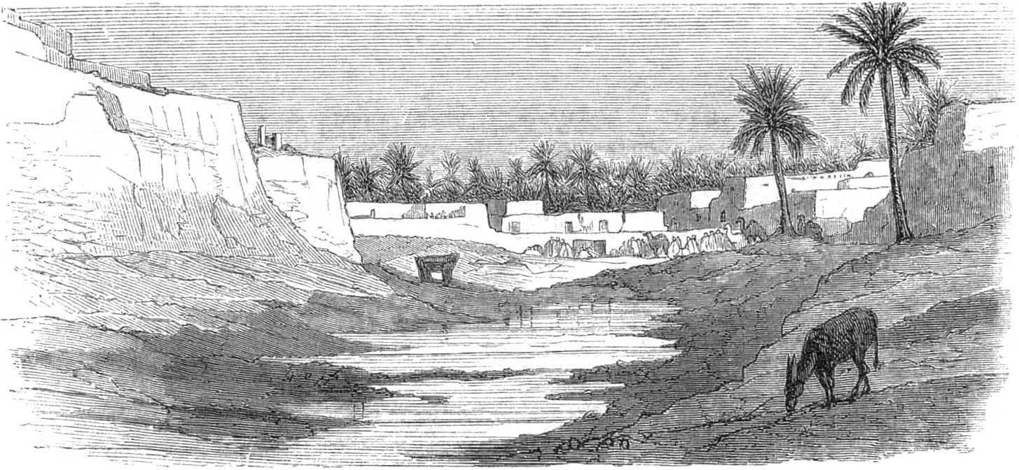 [140]Le gouffre froid de Biskra est un bassin, appelé El-Bourma par les Arabes, et ainsi dénommé par les Européens pour le distinguer de la source thermale de Hammâm-Sâlahîn, qui est dans le voisinage.