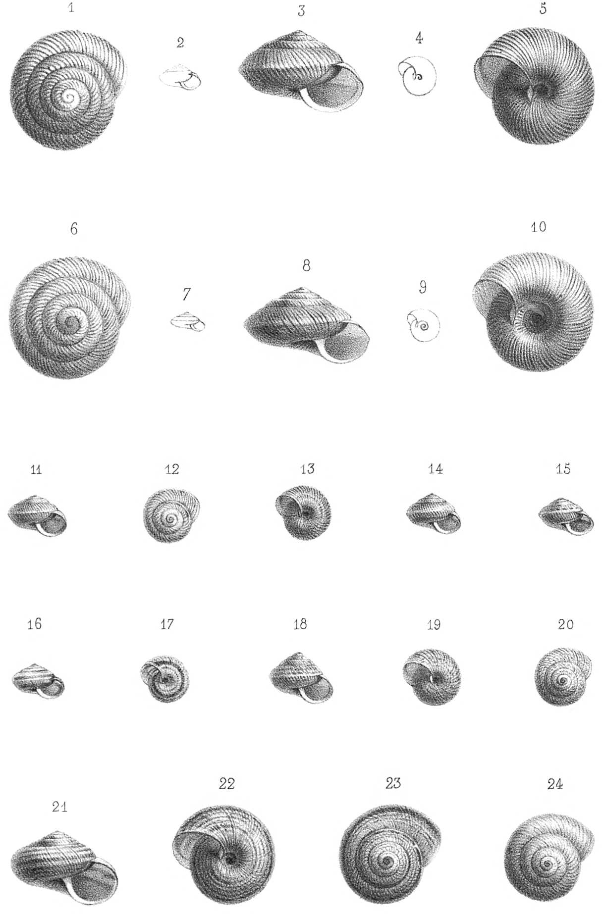 21. Helix Terveri (type). Coq. de grand. nat., vue de face. — 22. La même, vue en dessous. — 23. La même, vue en dessus. — 24. Variété, vue en dessus.