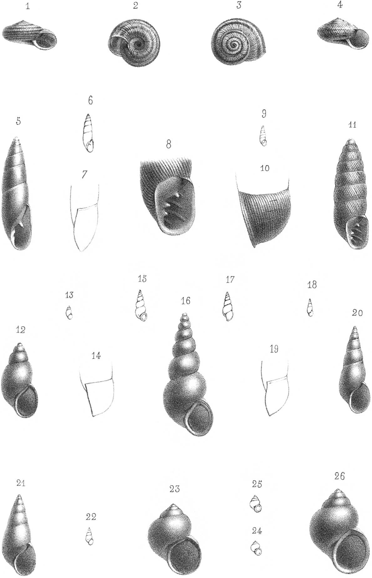 25. Bythinia pycnocheila. Coq. de grand. nat., vue de face. — 26. Coq. grossie, vue de face.