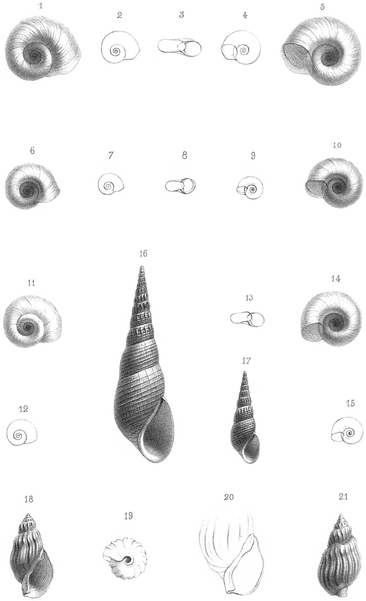 18. Melanopsis Maresi. Coq. de grand. nat., vue de face. — 19. Dernier tour vu en dessous. — 20. Dernier tour grossi, vu de face. — 21. Coq. de grand. nat., vue par le dos.