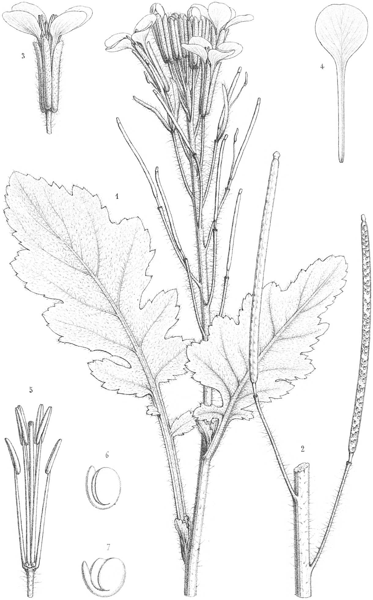 Planta annua. Radix indurata, fusiformis, fibras paucas emittens. Caulis erectus, robustus, subangulatus, in specimine completo suppetente circiter 5 decim. longus et subsimplex, pilis longis rigidulis albidis patentibus præsertim in parte inferiore hispidus. Folia alterna, oblonga vel obovato-oblonga, inæqualiter et grosse sinuato-lobulata vel inferne pinnatifida, inferiora in petiolum elongatum attenuata, superiora sæpius subsessilia, præsertim in petiolo et in pagina inferiore ad nervos densius pilis rigidulis longis hispida. Flores magni, 17-27 millim. longi, in racemum aphyllum primum confertum dein laxiusculum dispositi, siliquas juniores superantes. Pedicelli sub anthesi 15-20 dein 25-35 millim. longi, ut et petioli patenter longeque hispidi, erecto-patuli. Calyx dense patenterque hispido-villosus, sepalis oblongis erectis lateralibus basi subsaccatis. Petala lilacina interdum alba venis saturatioribus picta, limbo obovato integro, in unguem calycem subæquantem attenuata, calycem duplum subæquantia. Glandulæ hypogynæ 4, 2 trapezoideæ staminum lateralium insertionem[s32] circumvallantes, 2 ovato-lanceolatæ intra staminum longiorum insertionem. Stamina tetradynama, filamentis linearibus, membranaceo-complanatis, edentulis, liberis. Siliquæ in pedicellis ascendentes, glabræ, circiter 65-68 millim. longæ, 2-3 millim. latæ, pedicellum subduplum longæ, elongato-lineares, compressæ, stipitatæ stipite circiter 2 1/2 millim. longo, valvis membranaceis tenuibus uninerviis subtorulosis venulis lateralibus obsoletis ; septo membranaceo ; stigmate subsessili, tereti-compresso, obscure bilobo. Semina plurima, minima, biseriata, pallide fuscescentia, ovato-subglobosa, compressa, immarginata, lævia. Cotyledones obovato-suborbiculatæ, transverse latiores, conduplicatæ, radiculam in plicatura foventes. — Mense Februario florifera et jam fructifera lecta.