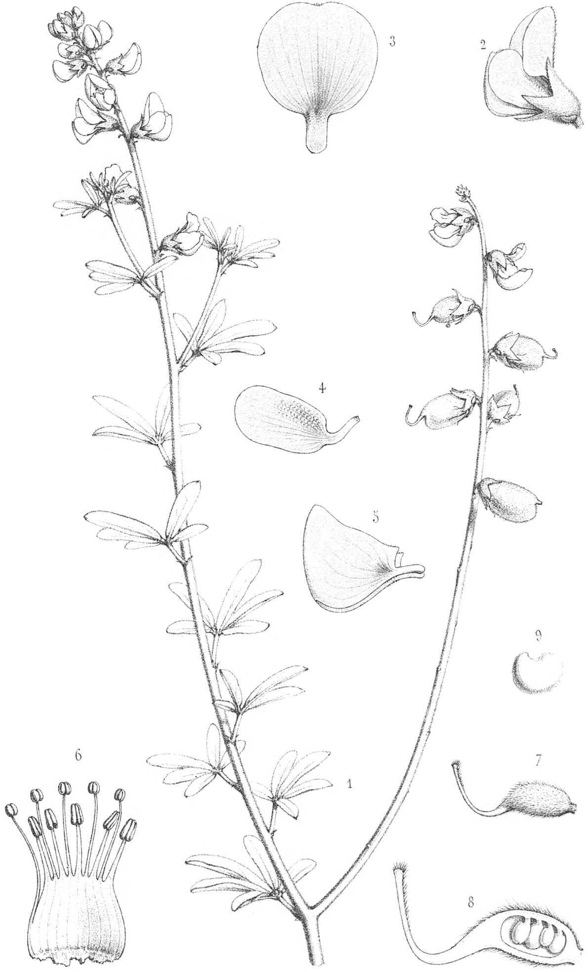 Planta dumosa, erecta, indurato-frutescens, divaricato-ramosa, ramis elongatis teretibus haud striatis pube densa brevi patente incano-tomentosis. Folia petiolata, palmatim composita, 4-5-rarius abortu 3-foliolata, foliolis cum petiolo articulatis, oblongis, obtusis, petiolo multo longioribus, utrinque pube sericea canescentibus vel pagina superiore minus pubescente virentibus. Stipulæ minutæ, lineares vel subulatæ. Racemi pluriflori (sub-10-flori), caules terminantes vel oppositifolii, laxiusculi. Bracteæ anguste lineares pedicello paulo longiores, demum deflexæ. Flores mediocres, circiter 1 centim. longi, nutantes, breviter pedicellati, pedicello tubo calycis breviore, bibracteolati, bracteolis calyci adpressis minimis linearibus. Calyx dense sericeo-villosus, tubo campanulato, limbo bilabiato, labio superiore bipartito, inferiore tripartito, laciniis lanceolatis subæquilongis vel inferiore paulo longiore, tubi longitudinem subæquantibus. Corolla flava, vexilli dorso excepto glabra, calyce subdimidio longior. Vexillum venis fuscescentibus saturatioribus pictum, magnum, alas et carinam subæquilongas subæquans, late obovato-subcuneatum, ascendens et inde limbi basis quasi cordata, in unguem latum intus incrassato-callosum callo villoso calycis tubum subæquantem contractum. Alæ liberæ, oblongo-obovatæ, obtusæ, plurinerviæ, extus in parte inferiore inter nervos corrugatæ, in unguem abrupte contractæ, demum ascendentes et carinam nudantes. Carina e petalis in dimidia longitudine superiore adnatis formata, ovato-inæquilatera dorso arcuato margine superiore recto, acutiuscula, petalis abrupte in unguem contractis et supra unguem late emarginatis. Stamina 10, alternatim inæqualia longiora antheris minoribus suborbiculatis breviora antheris majoribus ovato-oblongis, filamentis elongatis filiformibus, in longitudine dimidia inferiore complanatis et in tubum superne fissum coadunatis. Ovarium dense sericeo-villosum, stipitatum, oblongo-inæquilaterum ventre convexo, a lateribus compressum, in stylum sensim attenuatum, stylo tereti arcuato-ascendente ovarium subæquante apice et in latere superiore usque ad mediam longitudinem barbato, sub-6-ovulatum, ovulis ad basim suturæ ventralis insertis. Legumen nutans, brevissime stipitatum, dense sericeo-tomentosum,[s34] calycem plus quam duplum superans, oblongo-obovatum turgidum dorso gibbum, sutura ventrali basi styli mucronata obtusissime carinata, valvis valde inflato-ventricosis indurato-cartilagineis intus lana destitutis, abortu subdispermum. Semina (immature) suborbiculato-reniformia, compressa, lævia.