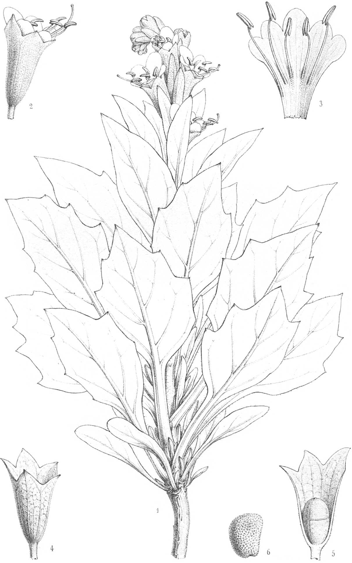 Planta indurato-perennans, plus minus pubescenti-viscidula, pallide et sordide virens. Radix fusiformis elongata, indurato-sublignosa. Caulis herbaceus crassus demum induratus, fistulosus, albidus, teres, erectus, in speciminibus junioribus vix florigeris sæpe 1 decim. non superans, demum sæpius 1 metr. et ultra longus, subsimplex vel superne ramosus. Folia crassiuscula ; infima rosulata, 6-20 centim. longa, 13-35 millim. lata, oblonga vel ovato-acuminata, in petiolum longiusculum marginatum attenuata vel contracta, integra, sinuato-repanda vel utrinque grosse angulato-dentata dentibus 2-3, petiolo cum nervo medio et primariis albidis ; caulina media ovato- vel oblongo-lanceolata, brevius petiolata ; bractealia multo minora, sessilia, oblongo-lanceolata vel oblongo-linearia, integra, basi apiceque attenuata, pleraque calycibus fructiferis breviora. Flores extra-axillares, singuli folio bracteali lateraliter suffulti, sub anthesi in racemum scorpioideum spiciformem secundum densum primum circinatum dein erecto-arcuatum dispositi, inferiores interdum longe superiores breviter pedicellati. Calyx pubescenti-viscidulus, 10-costatus, campanulatus, irregulariter ad tertiam partem 5-fidus, dentibus late ovato-triangularibus acutis sæpe mucronatis inferiore minore, sub anthesi viridulus, post anthesin accrescens, fructifer 20-28 millim. longus indurato-coriaceus et costis venisque prominentibus reticulato-venosus, marcescenti-persistens demum albidus tubo vix inflato campanulatus limbo ampliato erectiusculo hiante. Corolla sub anthesi calyce non latior et vix longior, infundibuliformi-subcampanulata a basi ad apicem sensim ampliata, ad quartam partem superiorem inæqualiter 5-loba, inter lobos 2 inferiores minores profunde fissa, lobis late ovato-triangularibus obtusis, extus pubescenti-viscidula et albido-virens, intus superne atro-violaceus absque venis purpureis, demum marcescens albida intus apice tantum violacea ovario crescente soluta et calycem longius superans. Stamina declinata, superiora subinclusa, inferiora exserta, filamentis albis filiformibus inferne complanatis ibique pubescenti-viscidis, antheris violaceis oblongis paulo infra medium in filamento insertis lobis infra insertionem discretis. Stylus longe exsertus, arcuato-declinatus, stamina inferiora subæquans vel superans. Capsula calyce[s36] abscondita, ejusque tubo brevior, ovato-oblonga basi haud ventricosa, chartacea, bilocularis, paulo supra medium circumscissa, operculo mucronato incomplete biloculari. Semina numerosa, subreniformia vel suborbiculata, contacta mutuo angulata, luteolo-fuscescentia, crebre reticulato-punctata.