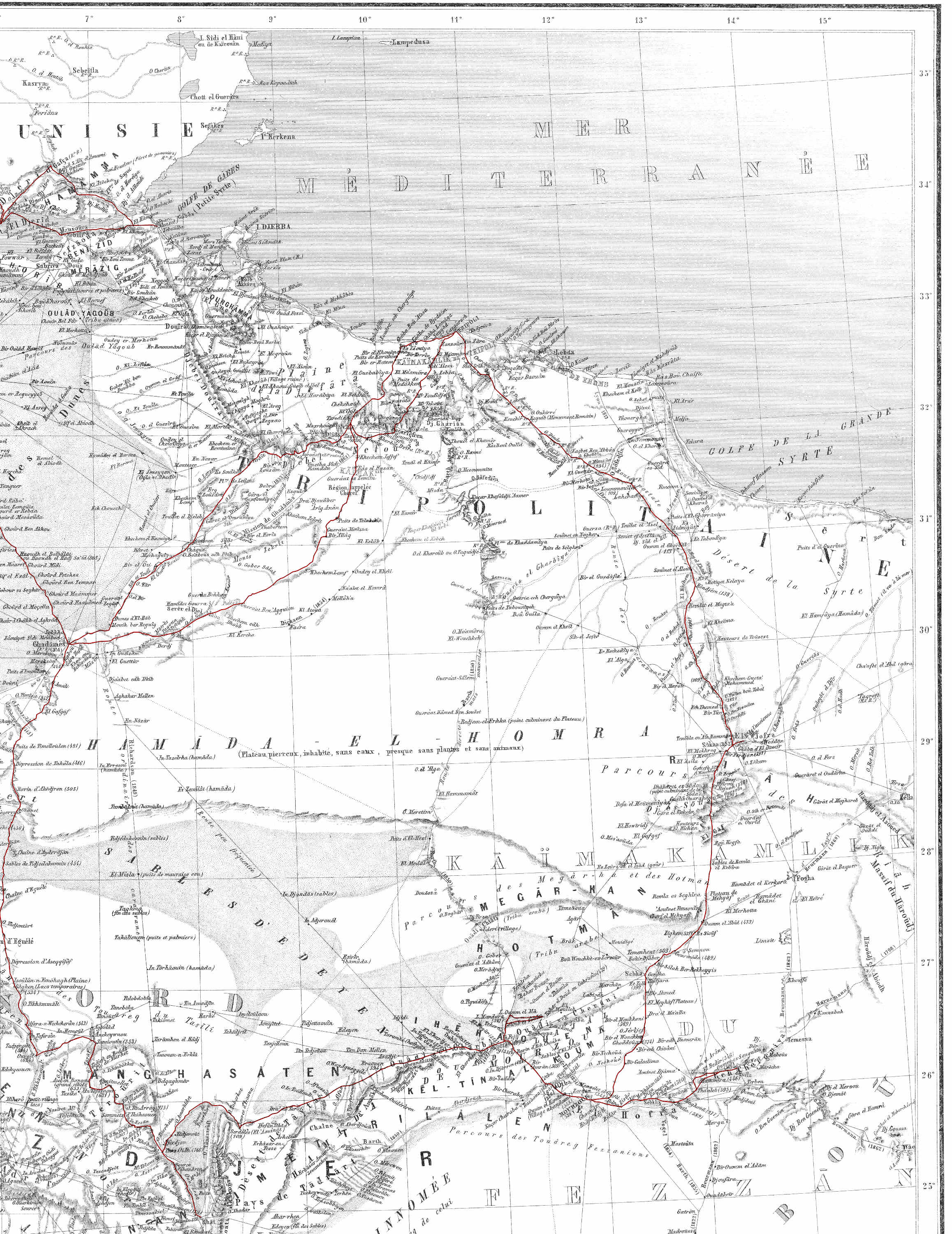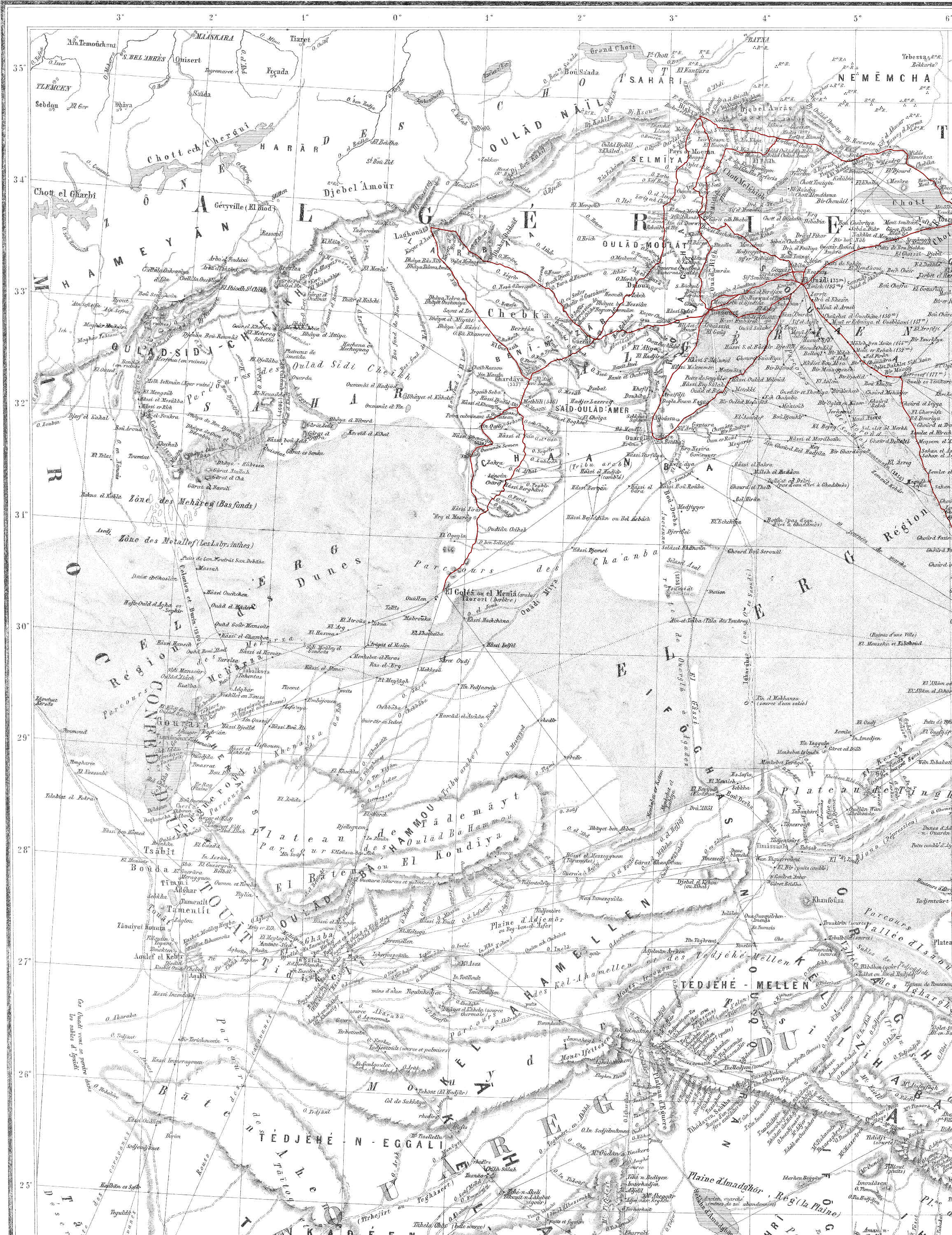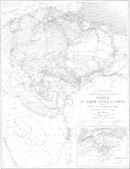 J’ai voulu avancer avec lenteur, afin d’opérer plus sûrement ; je n’ai pas craint de séjourner sur les points où je le jugeais nécessaire pour assurer le succès de mon entreprise, et je me suis toujours efforcé d’élargir ma zone d’action, en visitant les pays situés à l’Est et à l’Ouest de la ligne embrassée par mes études. Avant de pénétrer plus dans le Sud, j’ai donné à mes travaux une base large et[ii] solide, par une reconnaissance nouvelle du Sahara algérien, tunisien et tripolitain.