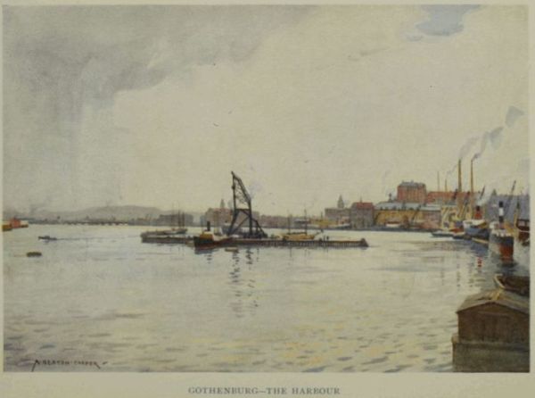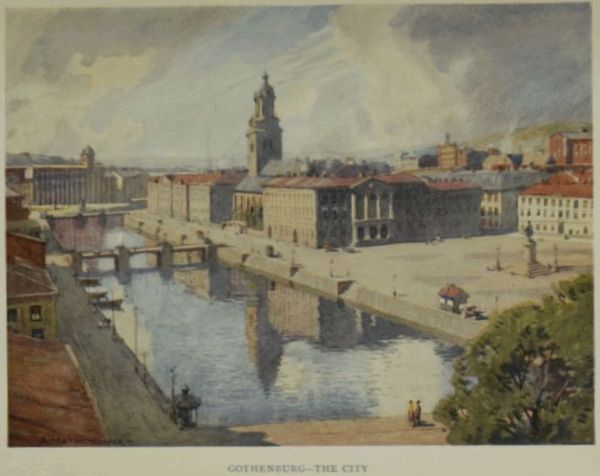 Like many other Swedish towns, Gothenburg is comparatively a modern city, but it stands on a site that is a veritable storehouse of legend and history, the adjoining territory having frequently changed hands or provided a battle-ground for those nations or piratical bands that were usually found contending for its possession. It was founded in 1621 by Gustavus Adolphus, after a visit which this enterprising and far-sighted monarch paid to the mouth of the river Göta älv early in that same year with the object of seeing if a commercial port could not conveniently be erected as close to the main ocean highways as possible to ensure his country becoming a factor in the world trade of the future. We are told that as he was deliberating on the matter, a bird who was being pursued by an eagle dropped suddenly at his feet, and that looking down at the utterly[22] exhausted bird he remarked that he could not look for a more promising omen.