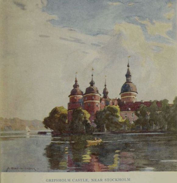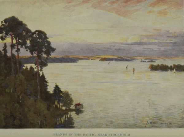 Of such is Swedish scenery, its main appeal lying, I fancy, not so much in the contour of its landscapes, beautiful though they be, as in the peculiar clearness of atmosphere that appears to endow every object with an almost magical quality of colour; and whether you visit the more southern regions and the enchanted island of Gothland in the Baltic, or travel north to Lapland, you will invariably find, not only sunsets whose beauty so transfigure every crag, island, or peak, that you begin to feel as if you have been transported from the common world into some wondrous world of phantasy, but a crystalline limpidity of atmosphere that makes every detail and contour of the most distant landscape stand out with faultless definition. It is this continual drama of surprise and delight that captures one’s very soul and that gives a visit to Sweden its characteristic charm.