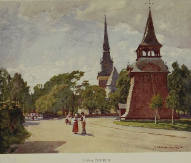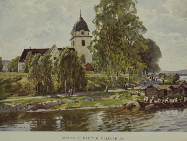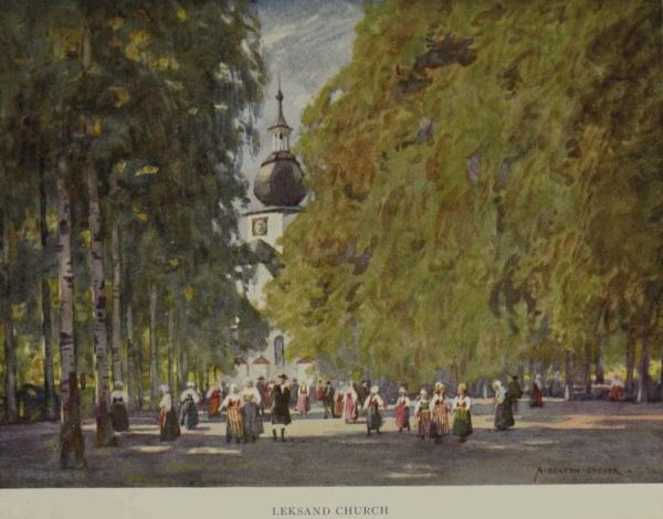 Across the lake, and at its most southernmost point, lies Leksand, which with Rättvik and Floda shares the distinction of being a centre of old mediæval Swedish peasant folklore and costume. The excursion to it is particularly interesting on a Sunday morning, if one travels to it by the special church boat. On these occasions the steamer calls in at various localities on the way to Leksand to collect the more distant parishioners, all clothed in their most becoming costumes, and her deck soon presents a very picturesque and animated[157] appearance. On arrival at Leksand the crowd makes its way to the fine birch-tree avenue leading to the quaint Russian-looking steepled church in which the service is to be held, and here the visitor should follow them and either join the worshippers inside the building, or await them as they come out after service. Of the two alternatives I found the second infinitely the more agreeable, as a Swedish Protestant service is an interminable affair, and sermons of thirty minutes’ duration appear to be lasting hours when one does not understand a word of what is being spoken. Nowhere, except perhaps in Slovakia and Roumania, have I seen such an array of picturesque and colourful costumes as those which are to be seen in Leksand on these occasions; and the scene that the people present in church as they troop down the nave preliminary to leaving it, or the kaleidoscope of colour which they make as they emerge into the avenue and stroll about or talk in groups, forms an unforgettable picture.