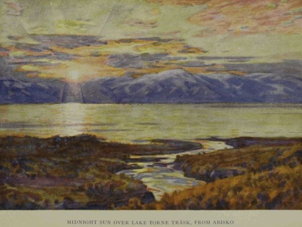 Before me, and encompassing not only Lake Torne Träsk to the north and west but also the Abisko valley to the south, were range after range of serrated snow-topped mountains which the clearness and mystery of the Swedish air were surrounding with a veil that was almost luminous, while above, pure clarity, illimitable, boundless, soared; with in the west over Pålnoviken, long bars of grey clouds tipped with gold which the night breeze was chasing northward. Suddenly, as if in answer to my hidden prayer, a spray of crimson light shot swiftly from behind a[191] cloud to the west and glittered through the air. It transformed every peak and headland into a glimpse of fairyland and illumined the lake with a shimmering band of gold, while the distant peak of Kebnekaise began to glow like a pyramid of frosted silver. Speechless I gazed spellbound at a sunset which, rivalling the most beautiful southern twilights which I have seen, in the glow and variety of colour that it displayed, afforded even greater pleasure in that, unlike any other, its changing tones did not pass rapidly into darkness, but lasted many hours without any real diminution of splendour. Purple and mauve and even blood-red was the sky, with here and there an island of rosy-tinted cloud which appeared to be floating in the empyrean; and as these colours slowly faded or changed to every variation of blue, the midnight sun continued to creep along the mountain crests which lay to the north-west, and the lake to turn to glittering silver wherever it was not shot with gold. It was like the gradual unveiling of a dim enchanted region where colours were softer and less troubled than a moment’s thought, and the air of so choice and rare a quality that one felt strangely invigorated by it. And only the sudden stirring of a chilly northern wind which swept[192] along the brow of the mountain recalled me to reality. We then remembered that we were cold and weary, that I had strained a leg muscle, and accordingly that steep as had been the ascent, the descent would probably prove even more arduous. And having accepted and drunk a cup of very warming coffee which two friendly Swedes, who had also accomplished the climb, insisted on forcing on us, we set our faces once more towards the valley and began the descent.