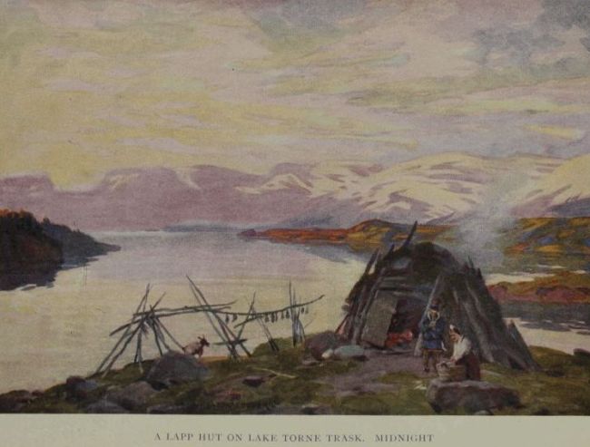 It was a wonderful night in June when I set out by motor launch one evening from Abisko to Pålnoviken, where I was to spend a night in a Lapp hut. And as I approached the small jetty that lies at the very extremity of the park of the Tourist Hotel, I had once again the unforgettable spectacle of the midnight sun, as it crept along the mountain crests to the north-west and illumined Lake Torne Träsk with a broad shimmering band of gold. The clear atmosphere peculiar to Sweden brought out every contour and object so vividly that even the most distant mountain summits appeared to be close at hand, while rising over the plain behind Abisko, which was covered with dense clusters of white-stemmed birch and juniper bushes, were the snow-clad Abisko Alps, and the strangely shaped semi-circular mountain pass called the Lapgate, through[177] which it is said that the Laplanders originally invaded the country. The contrast between the dazzling snow and mountain-tops, now coloured blood-red by the sun, and the verdant meadows and brawling rivulets, whose gurgling as they rolled over the stones was almost the only audible sound, was one of exceeding impressiveness, while the realisation that barely one hour before midnight conditions of light and sun prevailed identical to those existing in broad daylight in western countries created a sense of unreality in my mind that was as novel as it was pleasing. As we left the shore, however, a cold, bleak polar wind arose, whose freezing blast effectively recalled me to reality. It was one of those winds which chill you to the marrow; and as I was totally unprepared for it, it unmercifully settled on my person, percolated into my neck, up my arms and legs, and through my clothes, while it hovered persistently and pervasively in my wake. The realisation of the glorious sunshine above me, and the engrossing thought of the visit that I was contemplating, were too strong, however, to be weakened by such minor discomforts. And experiencing some of the sensations of virtuousness which are invariably felt whenever one[178] indulges in an exceptionally cold bath, I began to stride up and down the minute deck of the launch, full of the sense of well-being which is caused by reasonable bodily exercise under uncomfortable conditions. After more than an hour and a half of this constant buffeting, during which the Jake developed all the symptoms of a roughish sea, and the boat began to pitch and roll as if to the manner born, the wind suddenly flagged, tired, while the rumble and clatter of the engine announced that we had arrived. Creeping out of the deck chair into which I had finally found refuge and oblivion from the storm, I saw a little cove with a meadow in the background that sloped gently towards us, and behind it steep mountain-sides that were clothed with pine and birch. Gathering up my knapsack, I waited until the captain was ready to land, and then, preceded by him, went down the ladder and climbed up the incline leading to the meadow above. A hundred yards away were the Lapp huts of the settlement which I was to visit, and in almost as short a time as it takes to write down these words, we had arrived at the one in which I was to spend the night.