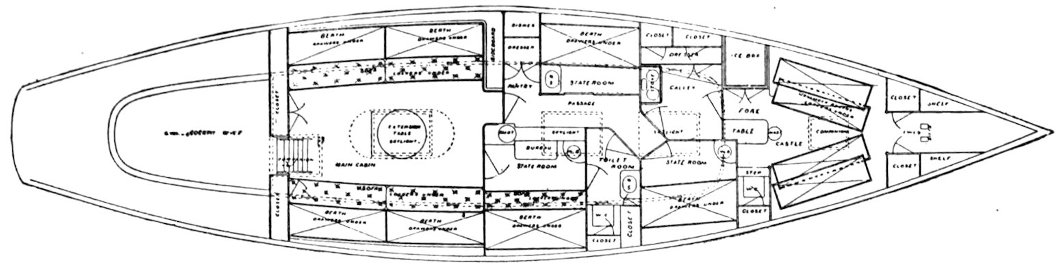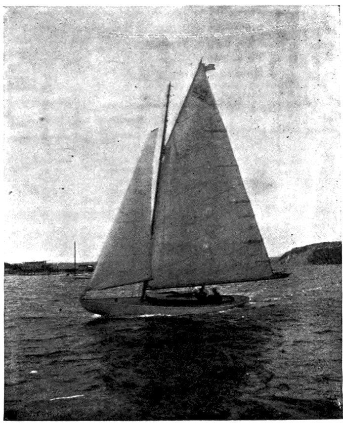 She is fifty feet long, has a sixteen-horse-power motor and goes nine miles an hour under naphtha alone. She also sails like a witch, is a splendid sea boat, and has “bully” accommodations below. Just the ideal boat for pleasant cruising. Never becalmed with sails idly flapping. Always sure of making port.
