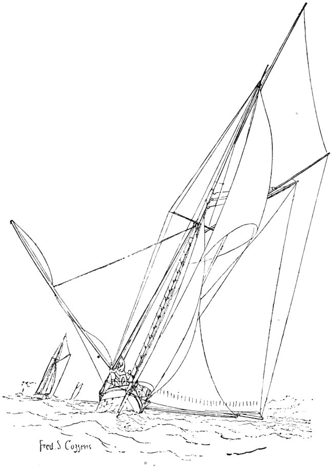 It will occur to you that the fancy attire to which I have alluded above will be inappropriate to any but the calmest and sunniest weather. Enough said! If you wish to gratify the heart of the yacht owner you will invest in a close crop and a clean shave preparatory 308to reporting aboard, and will carry nothing but a knife and a handkerchief in your pockets, leaving your jewelry and watch and keys and other personal bric-à-brac ashore. If you should chance to fall overboard during the race you will not feel sorry if you availed yourself of this valuable hint, for salt water plays the devil with the works of a timepiece, and but few watch-cases are actually fluid-proof. Besides, every ounce of superfluous weight militates against the speed of a craft, and “mony a mickle makes a muckle.”