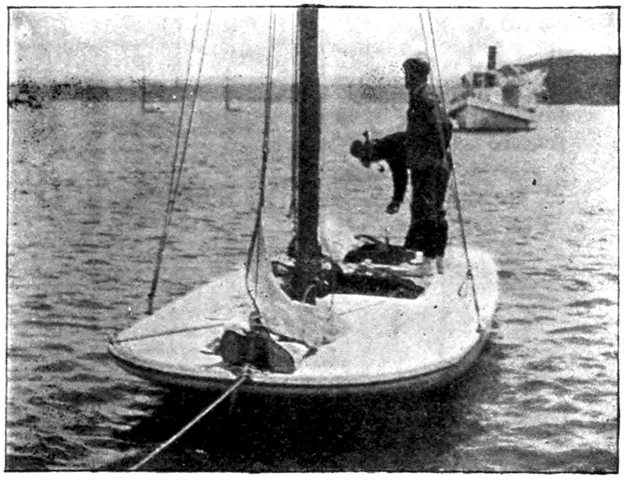 It is well for all hands to get aboard in good time, so as to have ample opportunity to prepare for the business of the day. I will take it for granted that you are properly clad for the work ahead, that you have left your frock coat and gafftopsail hat ashore, where they belong, and that your apparel is suited for the occasion. I am no Beau Brummel, to act as arbiter elegantiarum in the matter of attire afloat or ashore, but I have seen some queerly rigged specimens of amateur sailors in my time, and have observed what an amazing fund of fun they furnish to the curious onlooker surveying the scene from the outside. Gorgeous “blazers,” silken sashes of variegated hues, acting as soul and body lashings round the midship section and supporting trousers of spotless white jean, with the accessories of an expensive straw hat, a “biled” shirt, silken hose and pipeclayed deck shoes—all these may look ornamental and captivating, but the common-sense element of utility is lacking. Such bright plumage may be suitable for the deck of a steam yacht with pretty girls aboard, or for the casino of a swell seaside resort, but a simple suit of flannel and a white duck yachting cap is the sort of garb best adapted for the work to be tackled.