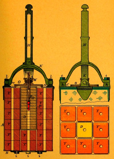 In the center of each cover, around the hole for the entrance of the leading-wires, is a brass rim fitted with a screw-thread outside, and bored out, inside, with a slightly conical taper, providing a seat for the packing.