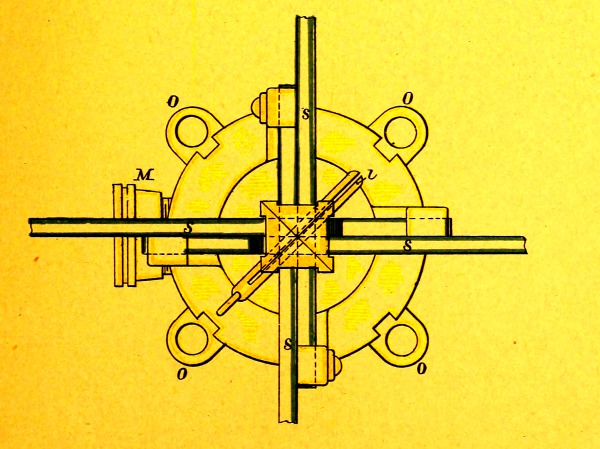 The circuit-closer consists of a cylindrical brass casting, having one end closed, and on this end are four feet by which it is secured to the lower head of the service torpedo by screws. The cylinder, 4¾ inches long and 5 inches in diameter, is closed at the open end by a screw-cover, having four lugs that serve as bearings for the contact-arms; these arms, four in number, work in slots cut in a plunger that passes through the center of the cap, and they are held in place by screws through the ends of two arms and their lugs. Inside the cylinder are two insulated contact-springs secured to binding-posts in an ebonite collar. This collar screws on the end of a short brass tube that carries a plunger tipped on the inner end with ebonite. A stout spiral spring in the tube through which passes this plunger, maintains, normally, the end of the plunger clear of the contact-springs. A rubber diaphragm separates the plunger in the cover from the plunger in the tube, and also acts as a washer to the cover, making the cylinder water-tight; a brass washer, laid on this diaphragm, acts as a friction-plate for the cover to turn on when screwed up. A safety-pin [Pg 5] through the outer plunger prevents its being forced in accidentally. When this pin is withdrawn, any pressure on the contact-arms tends to force the inner plunger in against the action of the spiral spring and to close the break between the contact-springs.