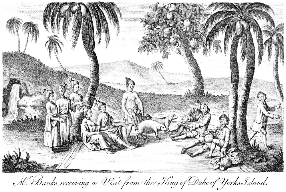 42On the 24th they discovered another island, which was named the Duke of York’s Island. A terrible sea breaks round the coast, but the place itself had a pleasing appearance. The boats landed with some difficulty, and brought off a large quantity of cocoa-nuts, which were a great relief to the sick. Thousands of sea-fowls were found sitting on their nests in high trees, and were so tame as to be easily knocked down, and there were great numbers of land-crabs on the ground. This island has a large lake in the midst of it, but has no inhabitants.