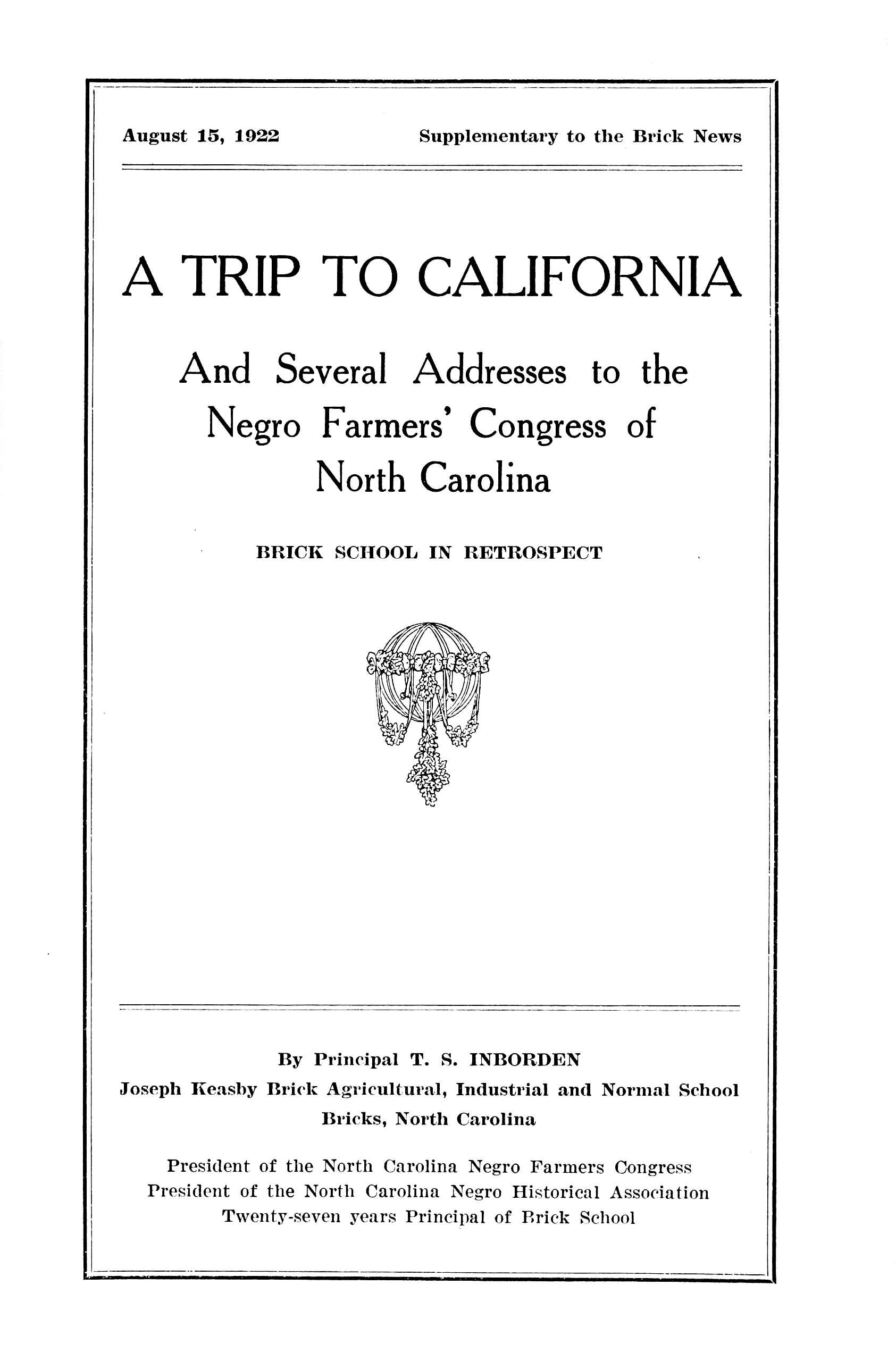 It is worth very much to any man who is interested in agricultural operations to take a leisurely trip four hundred miles through North Carolina in an automobile. A party of us left Bricks July 11th and joined Rev. P. R. DeBerry in Raleigh. Taking his big Studebaker car, we were off the 12th for a two days trip among the colored farmers of the central and western part of the state.
