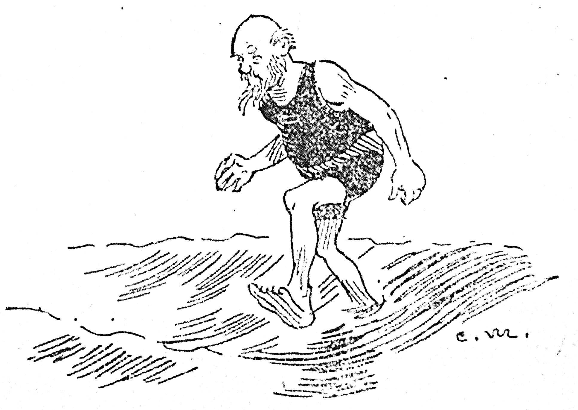 Eventually old John and Peter appeared, garbed like a pair of circus clowns. Stepping tenderly over the pebbles in their bare feet they advanced to the water’s edge. Old John, with his ponderous corporation covered with red, his long, hairy arms dangling about, and his long feet poking out before him, formed an interesting addition to the many humorous surf sights. Peter, in blue pants that were mostly trunk, might, at a distance, have passed for a girl.